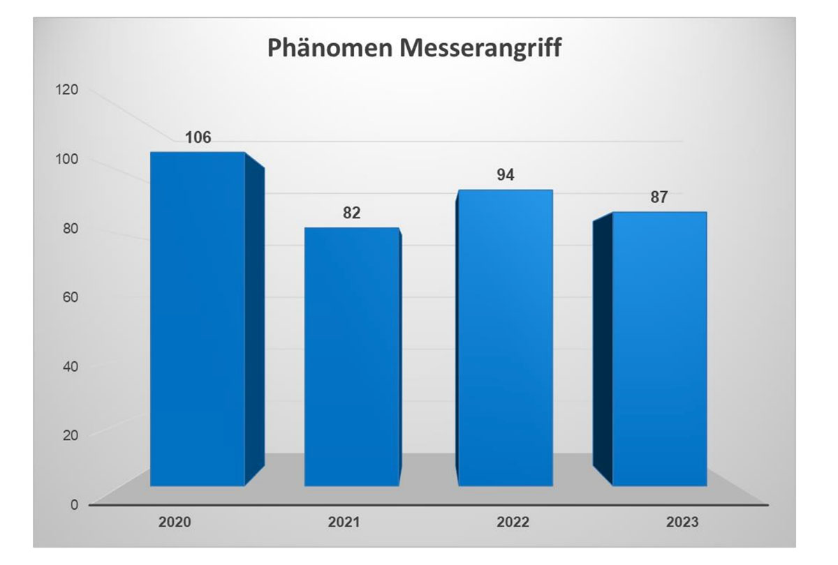 Auch wenn innerhalb der Bevölkerung häufig von einem Anstieg der Straftaten unter der Verwendung von Messern ausgegangen wird, zeigt die polizeiliche Kriminalstatistik in diesem Jahr das Gegenteil. Im Vergleich zum Jahr 2022 (94 Taten) konnte in diesem Jahr eine sinkende Tendenz von 7,45 Prozent festgestellt werden. Im Vergleich zum Jahr 2020, in welchem die Messerangriffe eine größere Rolle einnahmen ist eine sinkende Tendenz von 17,9 Prozent verzeichnet.