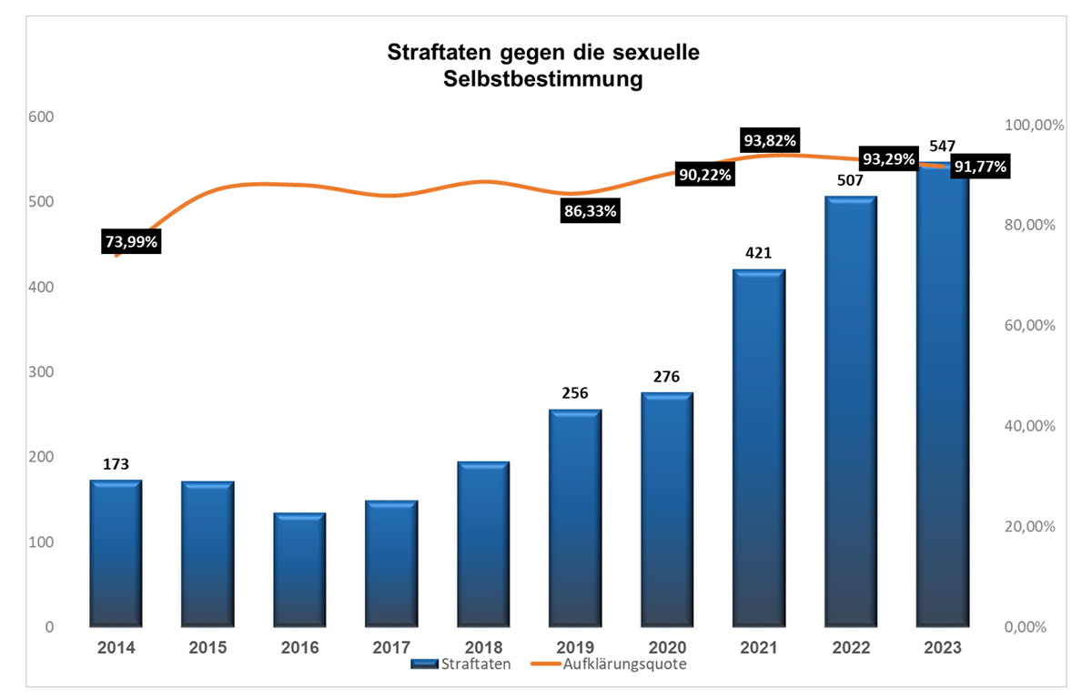 Die Straftaten gegen die sexuelle Selbstbestimmung sind in den vergangenen Jahren bundesweit und so auch in der Polizeiinspektion Nienburg/Schaumburg kontinuierlich angestiegen. Nachdem 2022 nur 507 Fälle verzeichnet wurden erhöhte sich diese Zahl in diesem Jahr auf 547. Die hohe Aufklärungsquote vom Vorjahr konnte mit 91,77 Prozent (2022: 93,29%) nahezu gehalten werden.