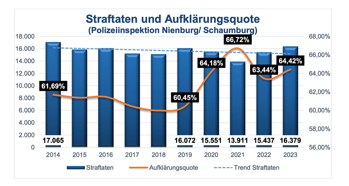 2023 wurden in der Polizeiinspektion Nienburg/Schaumburg 16.379 Straftaten erfasst. Verglichen mit dem Vorjahr verzeichnen diese einen Anstieg von 942 Taten, was eine Steigerung von 6,10 Prozent darstellt. Dies ist der zweithöchste Wert an Straftaten seit 2014. Dieser Anstieg spiegelt sich in allen Deliktsfeldern wider.