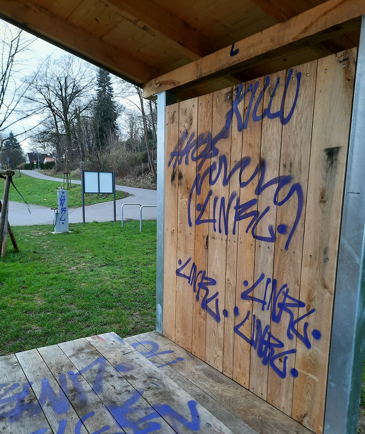 Erneut wurde – wie häufiger auch auf Spielplätzen, in Grünflächen und auf Friedhöfen zu beobachten – öffentliches Eigentum beschädigt. Unbekannte Täter haben vermutlich am vergangenen Wochenende den Anfang November 2023 von Landrat Ali Doğan und Bürgermeister Michael Jäcke offiziell eingeweihten Rast-Info-Punkt am Weserradweg nahe der Schachtschleuse mit Graffitis stark verunstaltet.