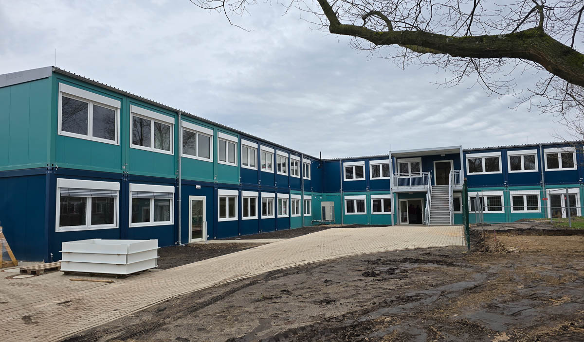 Das Interimsgebäude dient während der Sanierung als neuer Schulstandort und ist über die gewohnte Zufahrt „Am Weidenhof“ erreichbar.