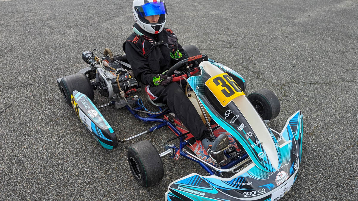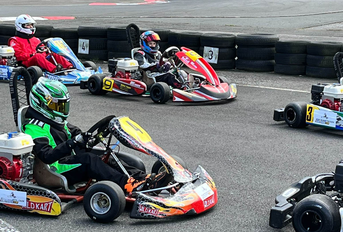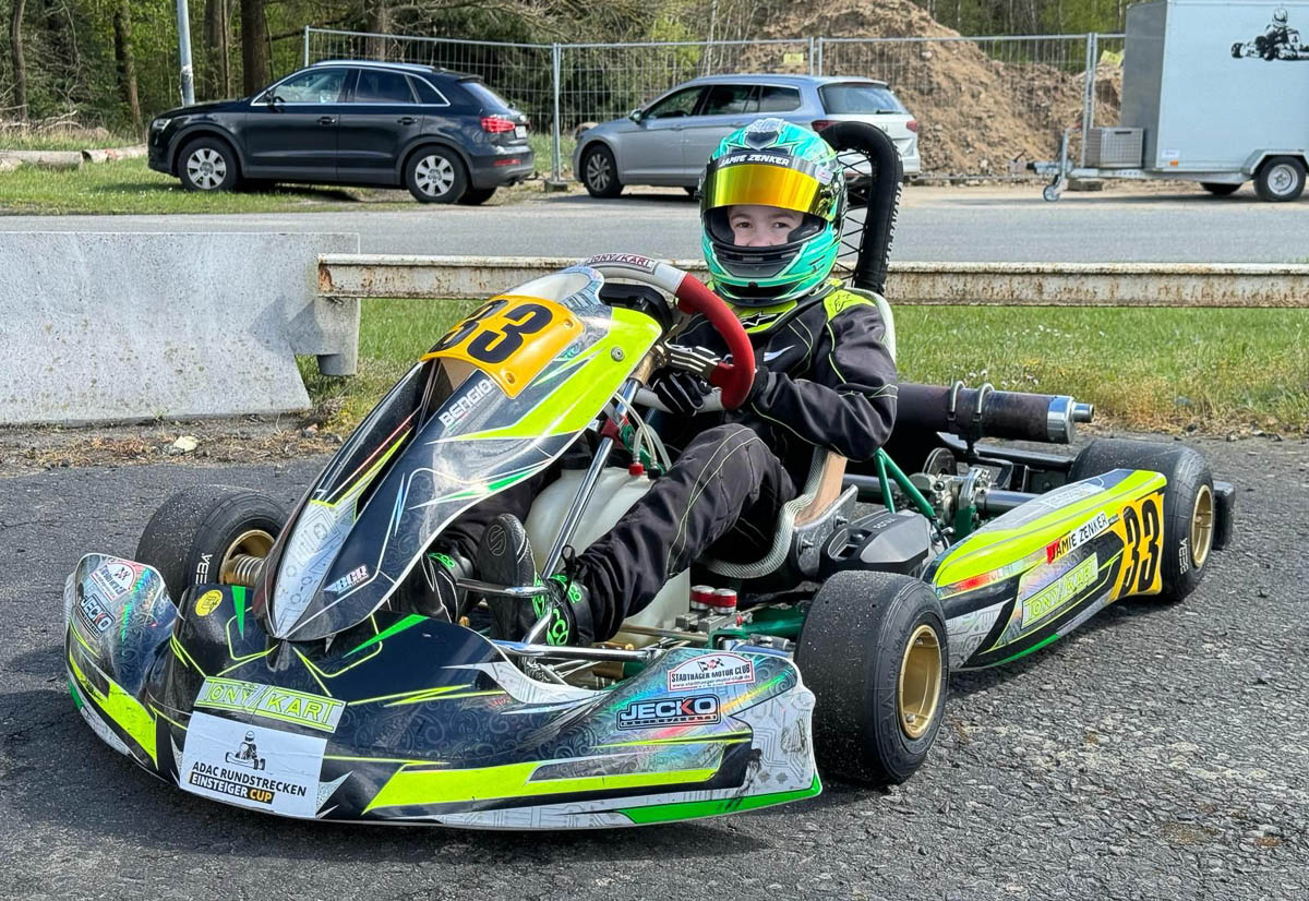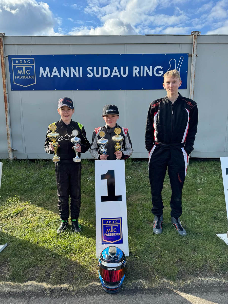 Die mit mehr PS-ausgestattete Gruppe Plus hatte dieselben Wettervoraussetzungen vor Ort und haderte auch mit der nassen Fahrbahn. Jamie Alexander Zenker (12 Jahre) ging von Platz drei ins erste Renen, Erik Tietz (15) von Platz sieben. Sofort setzte sich Jamie Alexander nach Startfreigabe vor auf Platz zwei und etwas später auf die Pole Position, die er dann auch mit reichlich Vorsprung bis ins Ziel beibehielt. Trotz der herausfordernden Wetterbedingungen zeigte Erik Tietz eine beeindruckende Leistung. Er fuhr konstant in den vorderen Positionen und zeigte starke Zeitfahrten. Im ersten Rennen des Tages erreichte er einen respektablen sechsten Platz. Für Rennen zwei konnte Jamie Alexander seine vorderste Position beim Start verteidigen und auch mit deutlichem Abstand ins Ziel fahren. Wieder mit Rang sechs beendete Erik den Lauf. Beim Start hatte er sich einen Platz erkämpfen können, verlor durch den Dreher eines anderen aber wieder einige Plätze.