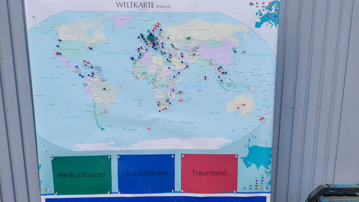 Gleich am Eingang der Veranstaltung erwartete die Besucher eine besondere Karte, auf der sie mit bunten Pins ihr Herkunftsland, ihr liebstes Urlaubsland und ihr Traumland markieren konnten. Diese interaktive Aktion zeigte eindrucksvoll die kulturelle Vielfalt und die globalen Träume der KiTa-Gemeinschaft.