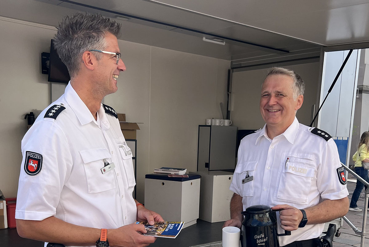 Zu den jeweiligen Wochenmärkten in den größeren Städten werden Daniel Jahn und Henri Slaar aus dem Präventionsteam der Polizeiinspektion Nienburg/Schaumburg allen Interessierten einen kostenfreien Kaffee oder auch Tee anbieten, um dabei ein zwangloses und lockeres Gespräch führen zu können. Natürlich ist das Heißgetränk keine Voraussetzung für die Kontaktaufnahme, kann aber im Zweifel eine erste gemeinsame Basis für einen Dialog sein. Auf Wunsch bietet die Polizei ein breites Spektrum an Inhalten: Vom Einbruchsschutz zum Enkeltrick, von Nachbarschaftsstreitigkeiten zur Nachwuchswerbung – oder eben nur ein Plausch über die täglichen Sachverhalte, die alle Menschen beschäftigen.