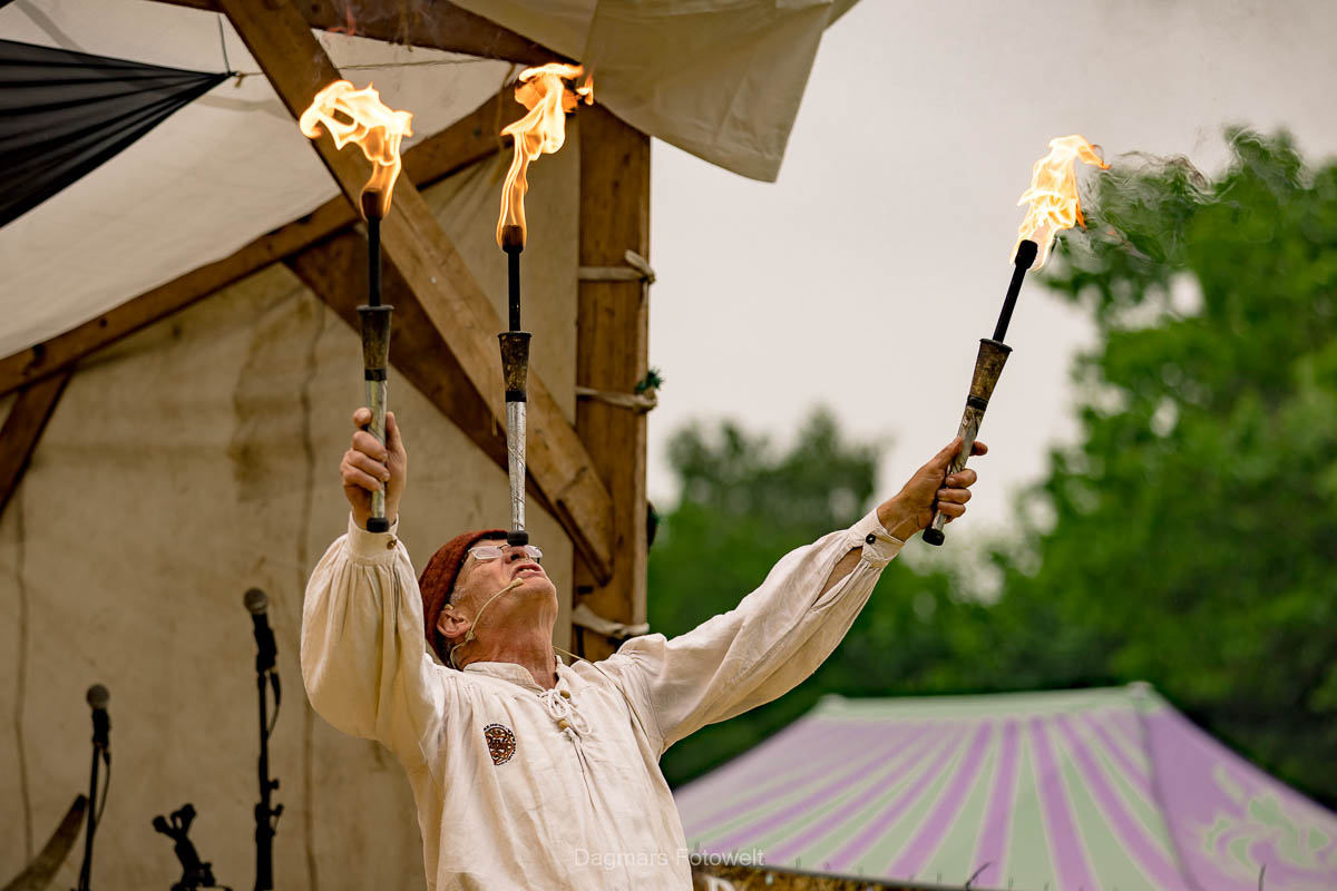 Auf den Kampfplätzen finden täglich mehrmals Turniere der Ritter zu Pferde und der Fußtruppen statt, und auf dem Platz unterwegs sind die Seifenblasenartisten von Nebenbeisorgenfrei und die der besonders bei Kindern beliebte Raptorex-Saurier. An den Samstagen erleben die Gäste nach Einbruch der Dunkelheit den schaurigen Pestumzug der Heerlager und die große Feuershow von Danse Infernale.