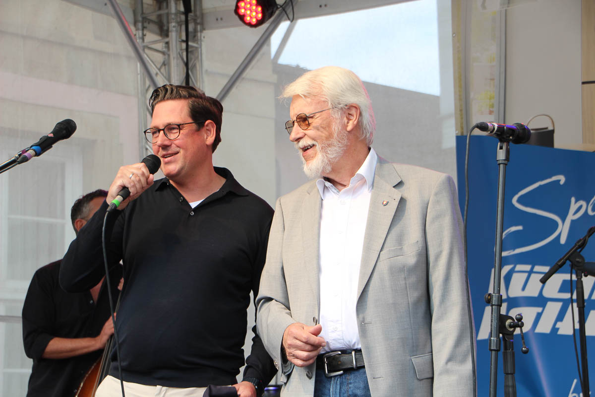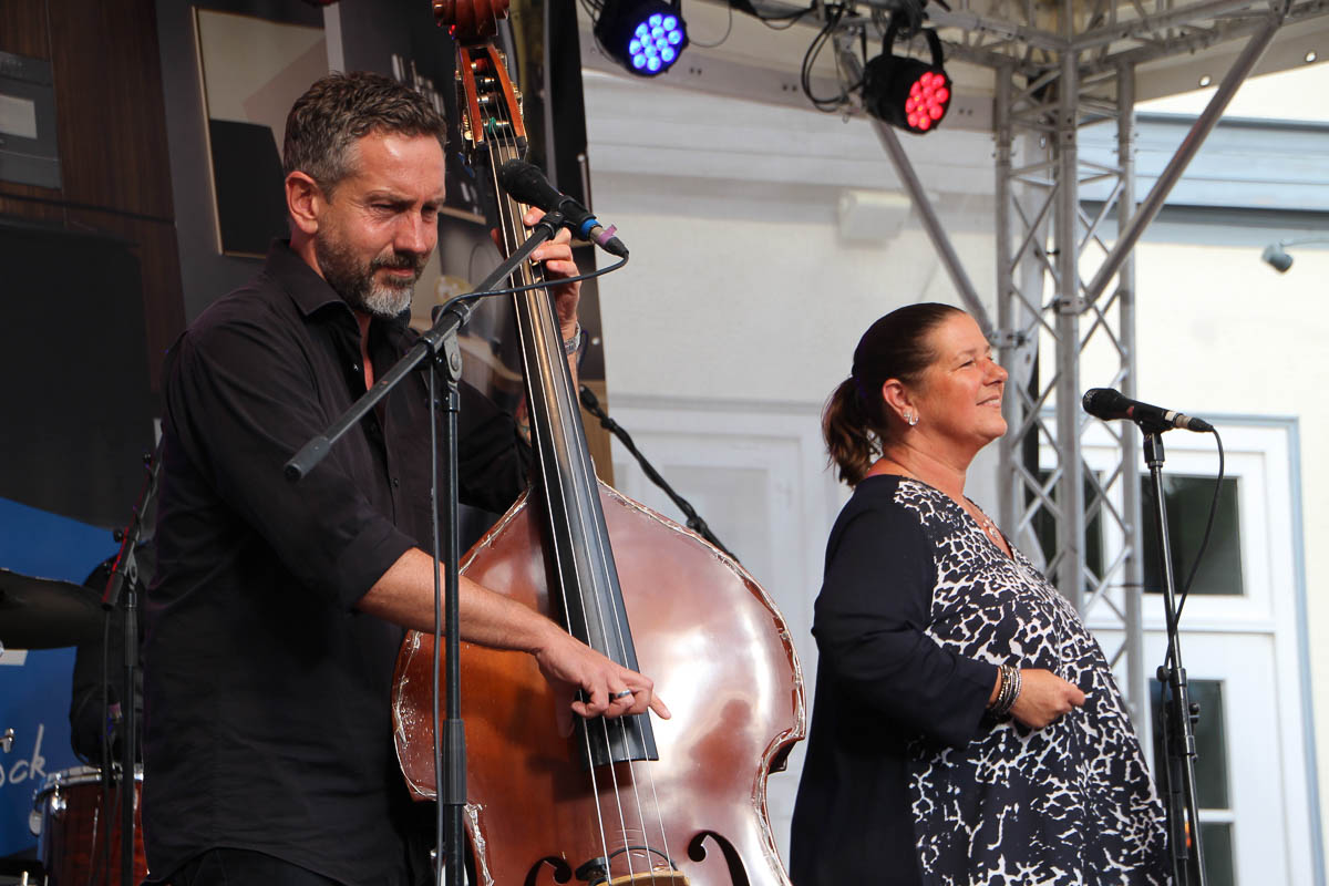 Daher war es auch nicht verwunderlich, am Abend einen gut gefüllten Marktplatz vorzufinden. Bei mildem Sommerwetter – ohne unheilvolle Gewitterwolken wie in der Vorwoche – versprach das zweite Bühnensommer-Intermezzo ein Genuss für die Sinne zu werden. B-Flat ist eigentlich eine Bezeichnung für eine Tonart, wie sich Bürgermeister Axel Wohlgemuth vor der Veranstaltung erklären ließ. In diesem Fall steht B-Flat jedoch schlichtweg für gute Musik, performt von leidenschaftlichen Profis.