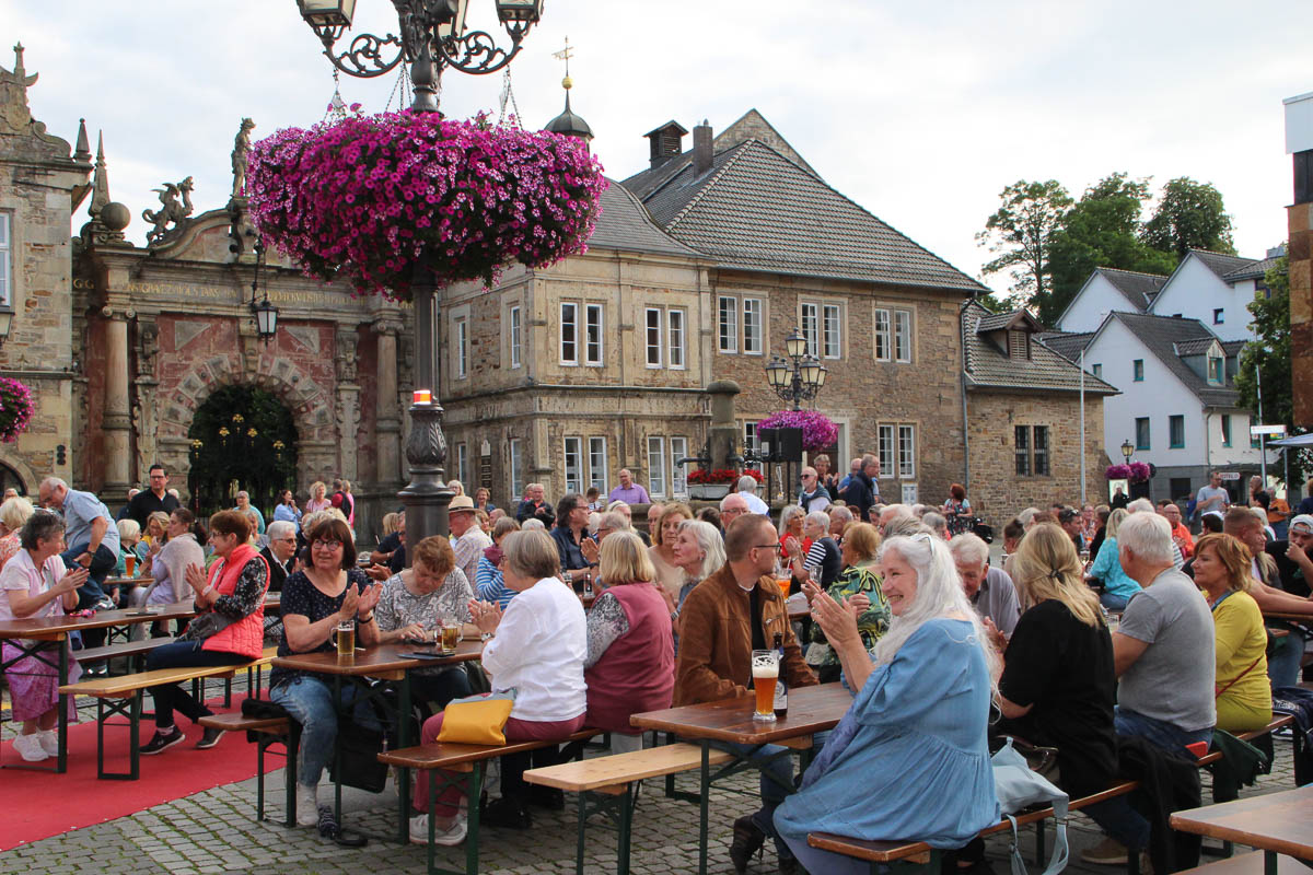 Mit einer leichten Brise Lounge und Jazz, auf die sich alle im Publikum einigen können, verwandeln sich auch altbekannte Klassiker wie Stings „Englishman in New York“ in schwungvolle Stimmungsmacher, die aktuellen Hits in nichts nachstehen. Vor allen Dingen die Vielseitigkeit macht den Charme von B-Flat aus. „Wir spielen auch ´Jingle Bells´ im Sommer – wenn es gewünscht wird“, schmunzelt Bianca Shomburg. An diesem Abend wussten aber andere musikalische Klassiker zu begeistern: Frank Sinatras „Fly me to the moon“ etwa oder Billy Joels „Piano man“, ebenso wie Stücke von Chris Rea oder „Nice little penguins“. Das Publikum lief mit den Songs, den über dem Rathaus wandernden Sonnenstrahlen und einem kühlen Getränk in der Hand so richtig warm, sodass auch die zweite Konzerthälfte schwungvoll ausfiel. Mit großem Applaus wurde eine Zugabe gefordert – da ließen sich Schomburg, Bohnenkamp, Klaude und Diewald nicht lange bitten und gaben einige weitere Schmankerl zum Besten.