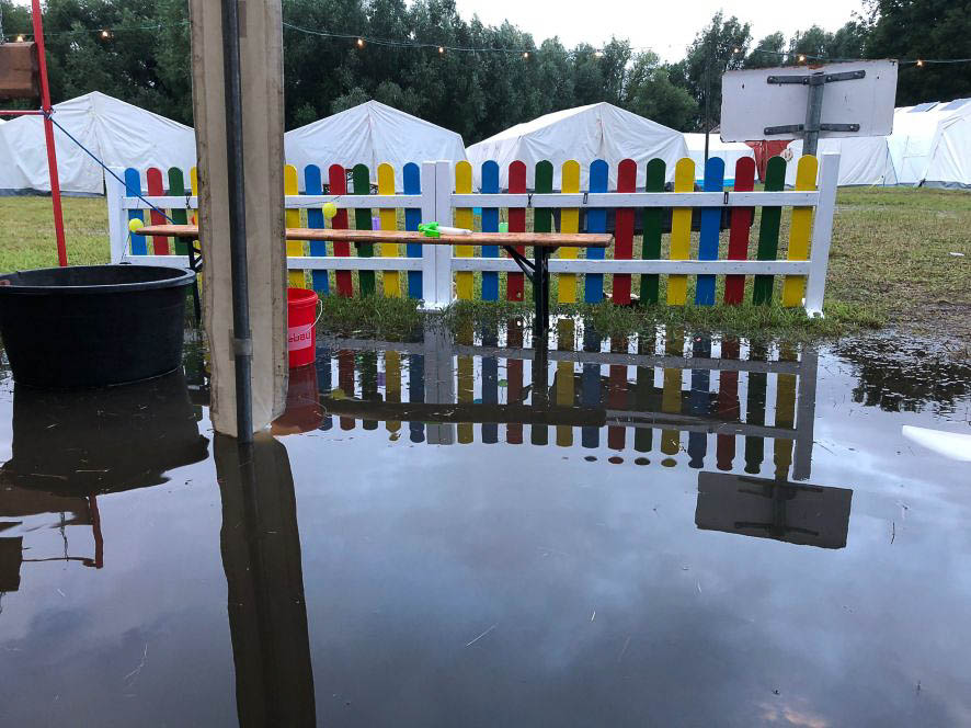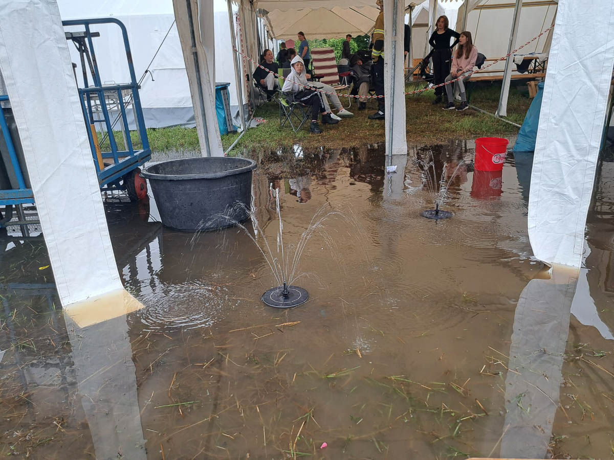 Nach einem warmen Tag folgte eine nasse Nacht. Am Montagmorgen wurde die Wohngemeinschaft „Rübennasenhausen“, bestehend aus den Jugendfeuerwehren Bückeburg-Stadt und Stadthagen, von einem neu angelegten Naturteich inklusive Frosch unter einem Pavillon und im Betreuerzelt überrascht. Rübennasenhausen nahm es mit Humor und benannte sich kurzerhand in „Nordseeheilbad Rübennasenhausen“ um und startete eine passende Playlist mit Songs wie „My heart will go on“ und „Unter dem Meer“. Dank eines Arbeitseinsatzes des Ressorts Bauhof wurde der Platz binnen weniger Stunden trockengelegt und ein Gehweg aus Paletten errichtet.