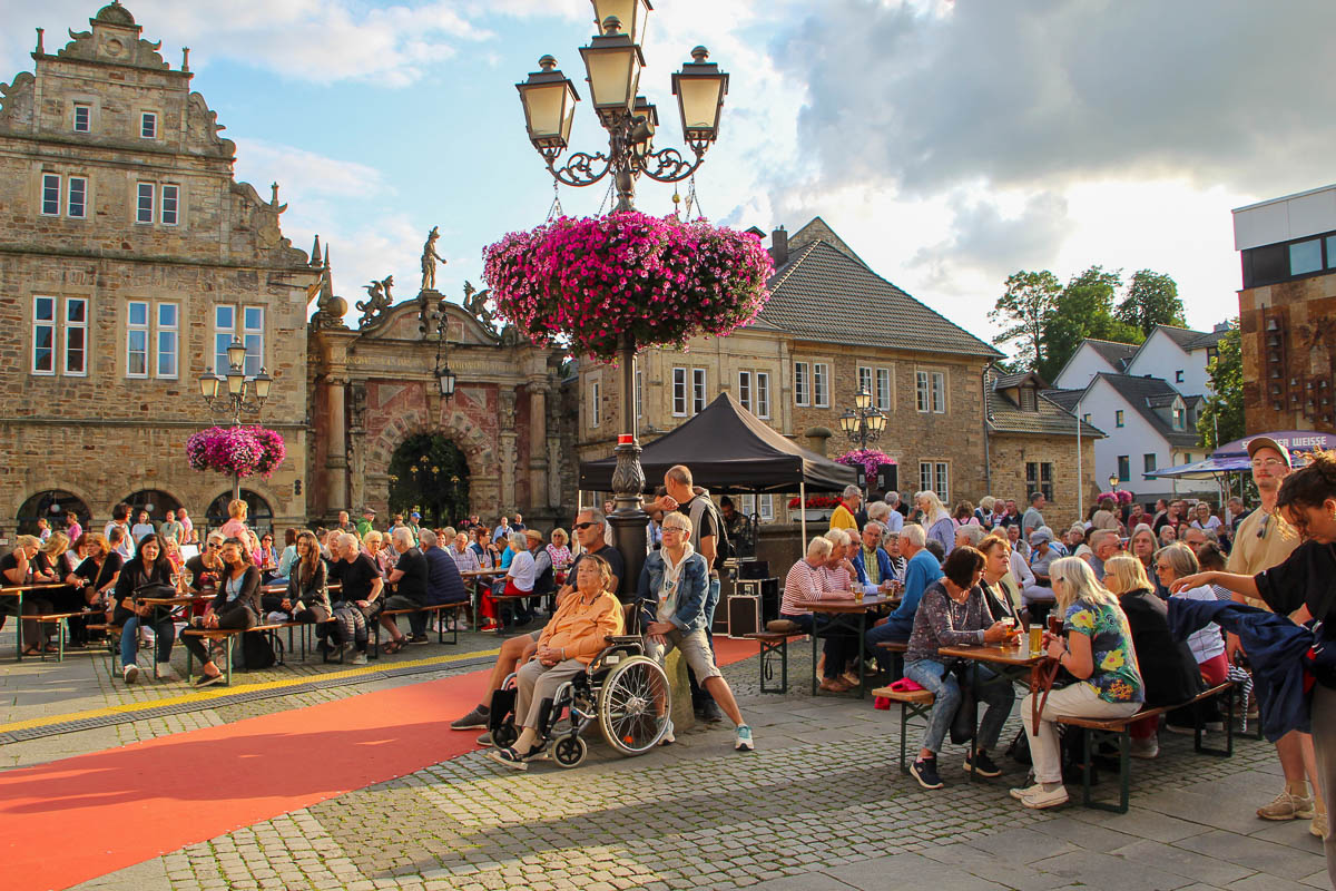 Alle vier Bandmitglieder – Maß, Marvin Splitt am Bass, Lennart Jütte am Keyboard sowie Luke Schubert an den Drums – machen schon lange Musik, sind „alte“ Bückeburger, wie Brüggemann zufrieden feststellt, und gingen auf das Gymnasium Adolfinum. Ein absolutes Heimspiel also auf dem Marktplatz, und dennoch für die vier „Lovingirl“-Musiker eine besondere Premiere. Mit feinfühligem und zugleich eingängigem Indie-Rock sowie ihrer Leidenschaft für die Musik schafft es das Quartett, das Publikum schnell für sich einzunehmen. Während Maß gefühlvoll, oft mit geschlossenen Augen die selbstgeschriebenen Songtexte performt, fühlen seine Bandkollegen Splitt, Jütte und Schubert an ihren Instrumenten den Sound bis in die Fingerspitzen und schaffen es gleichzeitig, diese Emotionen auch dem Publikum zu vermitteln.