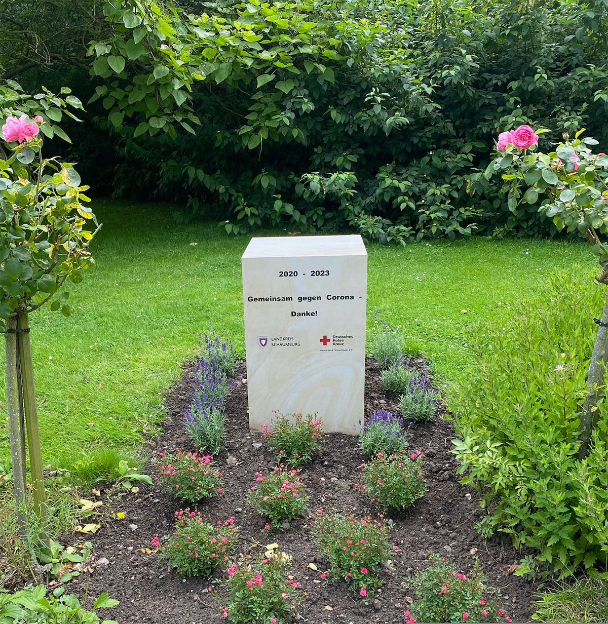 Dazu schlugen sie dem Landkreis einen schlichten Quader aus Obernkirchener Sandstein, platziert vor dem Gebäude der Kreisverwaltung in Stadthagen vor, dessen kurze Inschrift „Gemeinsam gegen Corona – Danke!“ allen damals Beteiligten danken und die Erinnerung an diese für viele unwirkliche Zeit des gesellschaftlichen Zusammenlebens Erinnerung und Mahnung zugleich sein sollte.