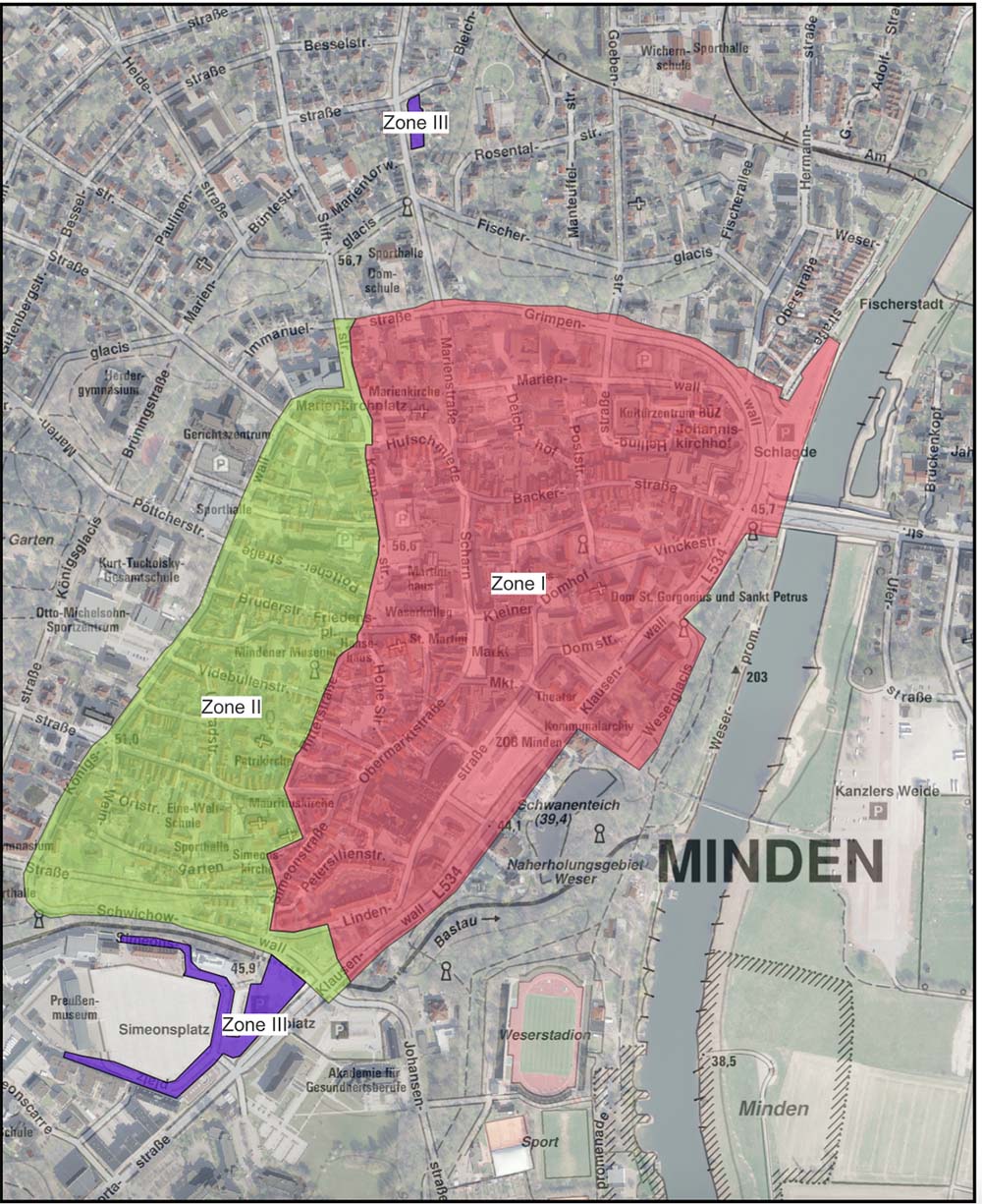 Die neue Parkgebührenordnung gilt ab dem 1. August 2024. Es gibt nur noch 3 Zonen: Zone 1 umfasst den Kern der Innenstadt, Zone 2 die Altstadt und das Weserglacis, Zone 3 die Marienstraße/Bleichstraße und den Simeonspatz/Dreiecksplatz (siehe Übersicht). Darüber informierte die Stadtverwaltung jetzt in einer Pressemitteilung.