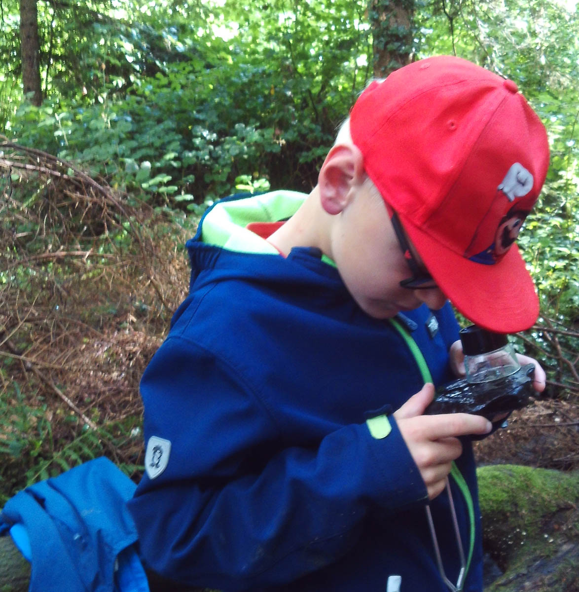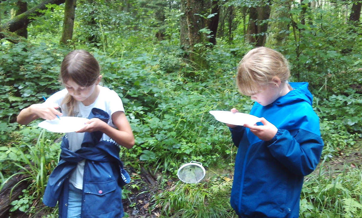 Die Mädchen und Jungen im Alter von 7 bis 9 Jahren wurden mit Lupe, Teller und Sieb ausgestattet und auf der Suche nach Kleinstlebewesen ging es dann über Stock und Stein.