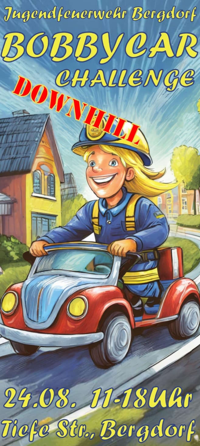 (Bückeburg) Die Jugendfeuerwehr Bergdorf lädt am 24. August zu einem actiongeladenen Bobbycar-Rennen ein, das von 11:00 bis 18:00 Uhr in der Tiefen Straße in Bergdorf stattfinden wird.
