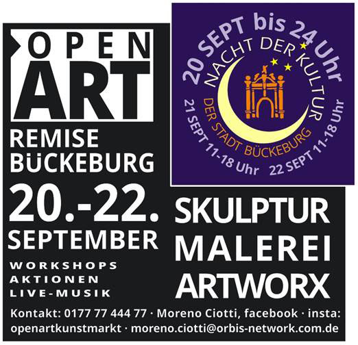 Im September dreht sich in Bückeburg alles um die Lange Nacht der Kultur und zusätzlich zu den bereits angekündigten, zahlreichen Veranstaltungen der Innenstadt laden die Künstler an der Remise von Freitag bis Sonntag im Gebäude und davor ein, Teil des großen Kreativ-Events zu werden. Am Freitag, zur Langen Nacht der Kultur (von 18 bis 24 Uhr), gelangt man mit den Eintrittsbändchen zur Veranstaltung im Gebäudeinneren. Auch draußen werde für Aktionen gesorgt sein, verspricht Ciotti, sowie für Snacks und Getränke. Mehrere Dutzend Teilnehmer werden ihre Werke über die drei Tage verteilt präsentieren.