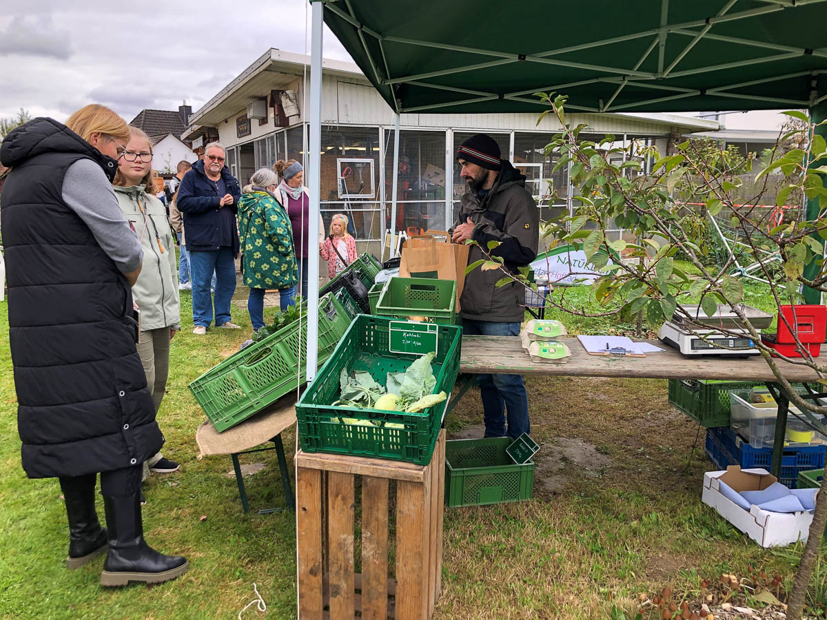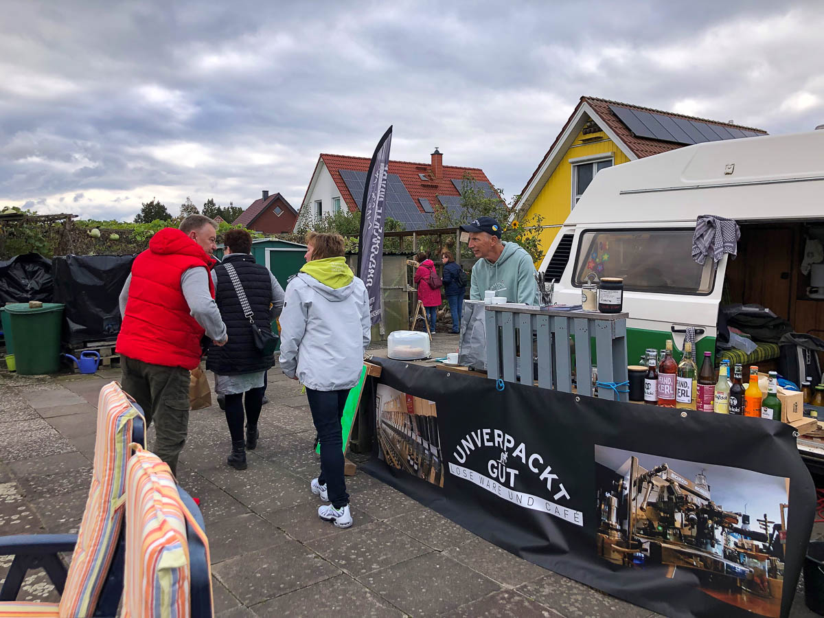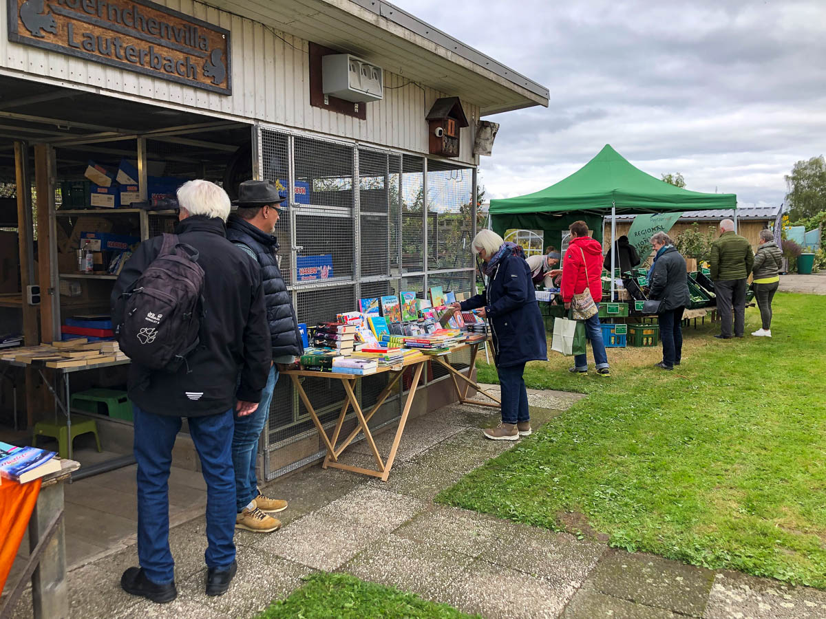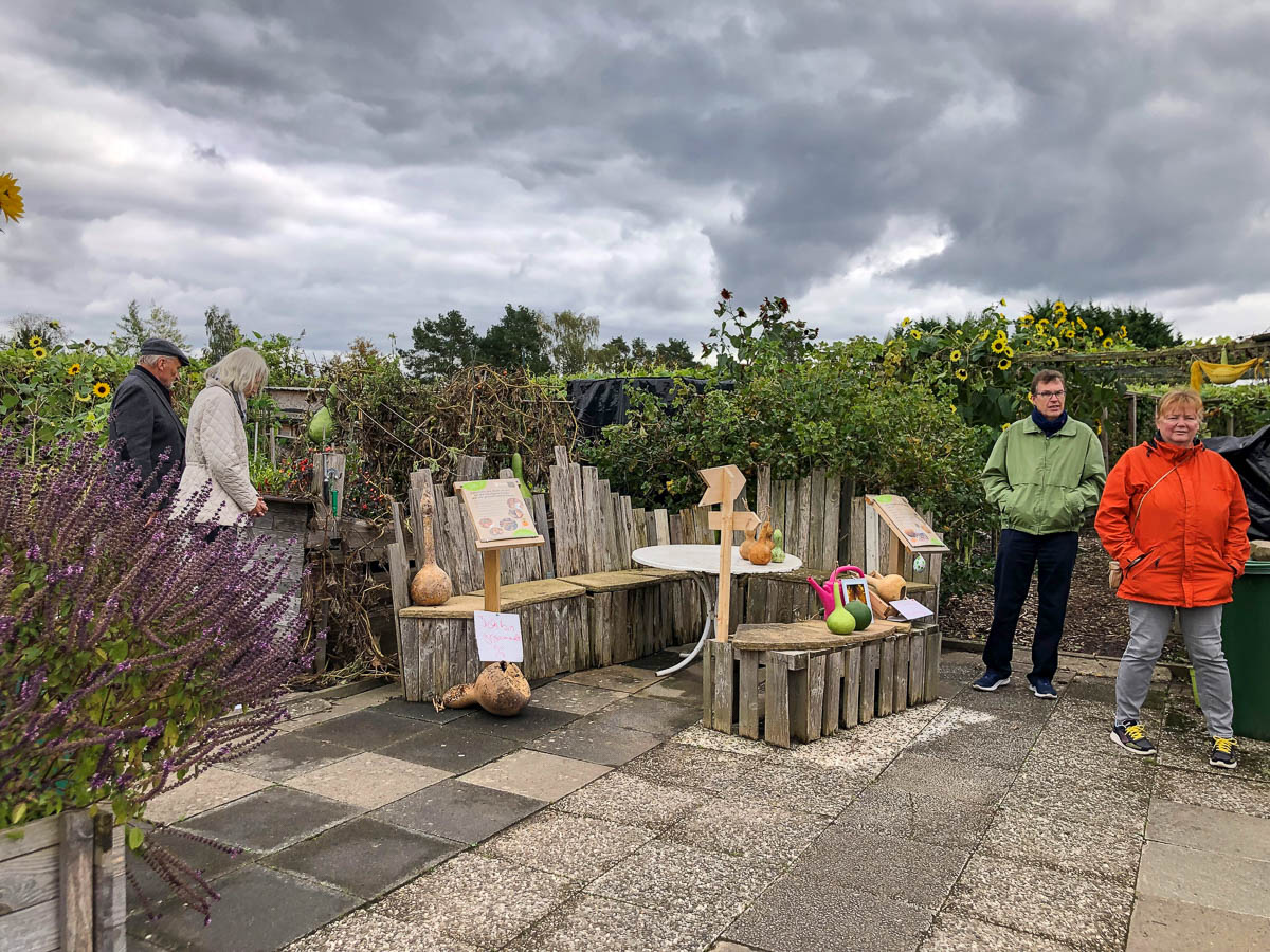 Nach Lustwandeln, Kalebassenlehrpfad und Lampenausstellung waren die Besucher meist ausgezerrt und durstig – wie gut, dass der Bückeburger Unverpackt-Laden mit einem großen Getränkesortiment anwesend war und die Gäste standesgemäß verköstigte. Der frische Kaffee lockte die Gäste mit hoher Sicherheit an, die gerne an den Tischen in der gnädigen Herbstsonne verweilten. Derweil bot der Peetzer Hof eine beträchtliche Auswahl an selbst angebautem Gemüse und Obst feil – inklusive praktischer Tipps für Anbau und Lagerung. Von Familie Grimpe aus Rusbend gab es leckeren Honig, ein großer Büchertrödelstand sorgte für interessiertes Wühlen, und Künstler Peter Spielmann wusste mit seinen Skulpturen zu begeistern. Ob Eule, Frosch oder Vogeltränke – seine Werke aus heimischem Stein bereichern jeden Garten. Besonders seine Interpretationen berühmter Charaktere aus Film, Fernsehen oder Geschichten erfreue sich besonderer Beliebtheit – sein jüngst angefertigter Udo Lindenberg zumindest freut sich an diesem Tag über ein neues Zuhause.