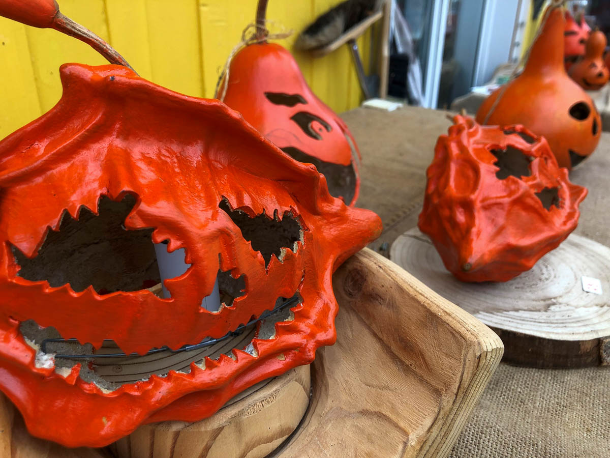 Wer sich die Arbeit sparen möchte, konnte an diesen beiden Tagen bereits anfertigte Halloween-Kalebassen erwerben. Solange die Kürbisse trockenstehen und pfleglich behandelt werden, halten sie mehrere Jahre – im Gegensatz zu den Original-Kürbissen, die nach einem Herbst in sich zusammenfallen. Sieht oft auch gruselig aus, ist aber nicht sehr nachhaltig.