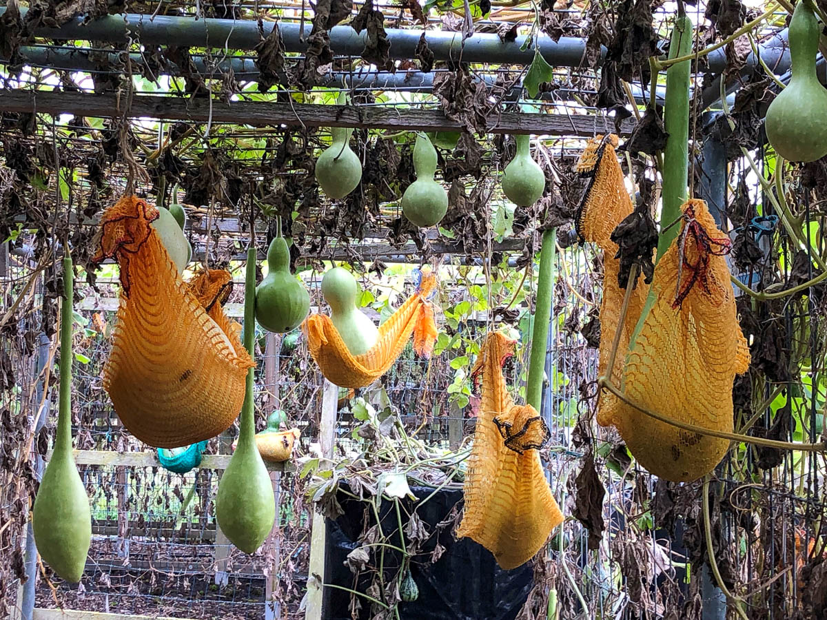 Denn diese sorgen immer wieder verlässlich für Begeisterung bei den Besuchern, die mit offenen Mündern, den Blick meist nach oben Richtung Spaliere gerichtet und das Handy fotobereit in der Hand, die hunderte Meter Laubengänge entlangspazieren und über die Ausformungen der vielseitigen Flaschenkürbisse staunen. Besonders beliebt für Fotos sind hier die langen Schlangenkalebassen als auch die besonders dicken Exemplare, deren Masse mit kleinen Hängematten gestützt werden.