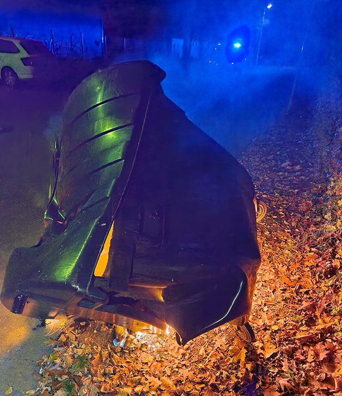 Der Abfallbehälter wurde durch das Feuer zerstört.