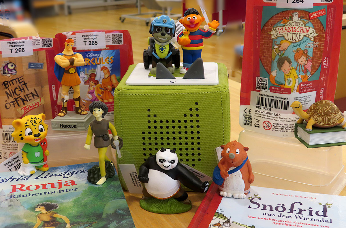 Die kleinen Figuren sind im Design des jeweiligen Hörspiels gehalten. Die Figuren werden auf eine spezielle Box gestellt, die als Lautsprecher fungiert, und dann erklingt die jeweilige Geschichte. Eltern schätzen besonders die unkomplizierte Handhabung, die auch für kleinere Kinder geeignet ist. Für alle Kinder, die selbst kein Tonie-Abspielgerät haben, stehen acht dieser Boxen zur Ausleihe zur Verfügung. Kinder bis zum 18. Lebensjahr können das altersgerechte Angebot der Bücherei kostenfrei nutzen.