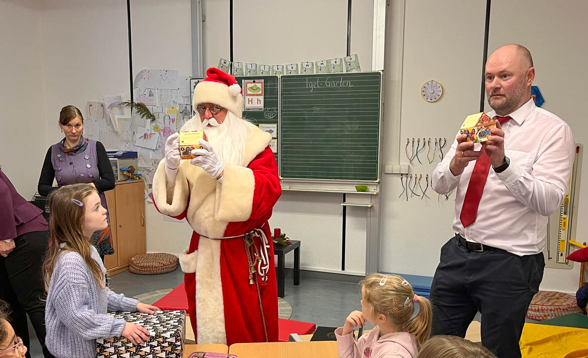 Zudem dürfte sich jede der 17 Klassen ein größeres Geschenk wünschen – ganz beliebt sind hierbei Murmelbahnen und Sensorik-Pfade, die den Kindern Spaß machen und zugleich einen niederschwelligen Lerneffekt mit sich bringen. Zur „Bescherung“ kam zudem auch Bürgermeister Axel Wohlgemuth vorbei.