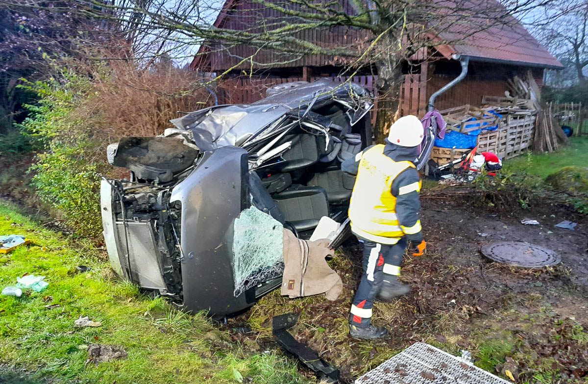 Eine Frau aus Rusbend befuhr mit ihrem Auto die Deinser Straße in Richtung Schierneichen. Aus ungeklärter Ursache kam sie nach rechts von der Straße in einen tieferen Straßengraben ab. Das Fahrzeug prallte dann mit der Beifahrerseite gegen einen Baum und blieb schließlich auf der Fahrerseite liegen. Die Frau zog sich dabei leichte Verletzungen zu, konnte sich aber nicht aus eigener Kraft befreien. Eingeklemmt war sie jedoch nicht.