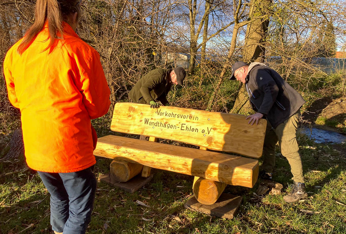 Da ihr diese ausstehende schriftliche Genehmigung schon 2023 bekannt war, hatte sie vorab die Sparkasse Schaumburg, vertreten durch ihren stellvertretenden Marktbereichsleiter Fabian Grote, als Sponsor für eine Bank gewinnen können. Diese Bank fertigte meisterlich Dennis Dreyer, Ortsvorsteher aus Krebshagen, an. Er stellte sie zusammen mit dem heutigen Ortsbürgermeister von Wendthagen-Ehlen, Michael Koller, an dem früheren Standort auf.