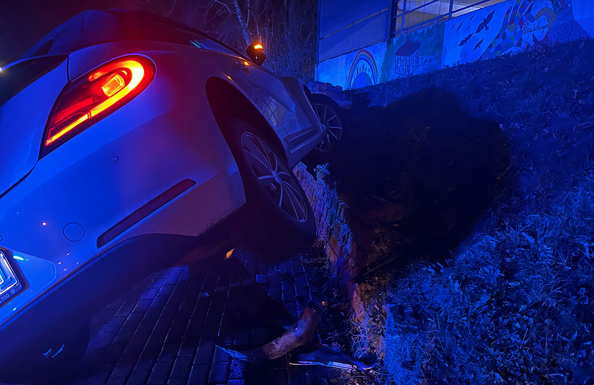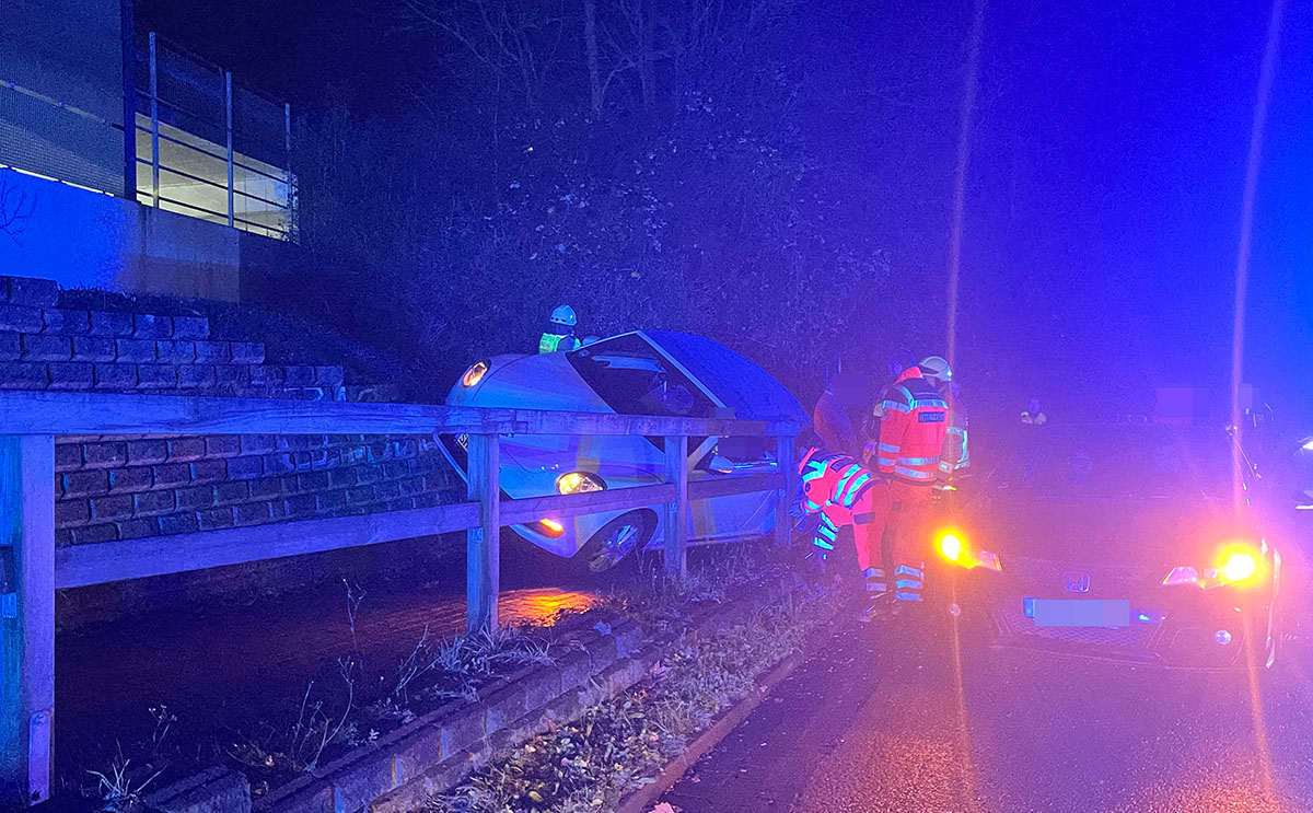 Auf der Beifahrerseite war der PKW teils in der Luft und wurde mit dem „Stabfast“-System aus Wendthagen gesichert. Die Person im PKW war glücklicherweise nicht eingeklemmt, konnte aber aufgrund des Geländers nicht aussteigen.