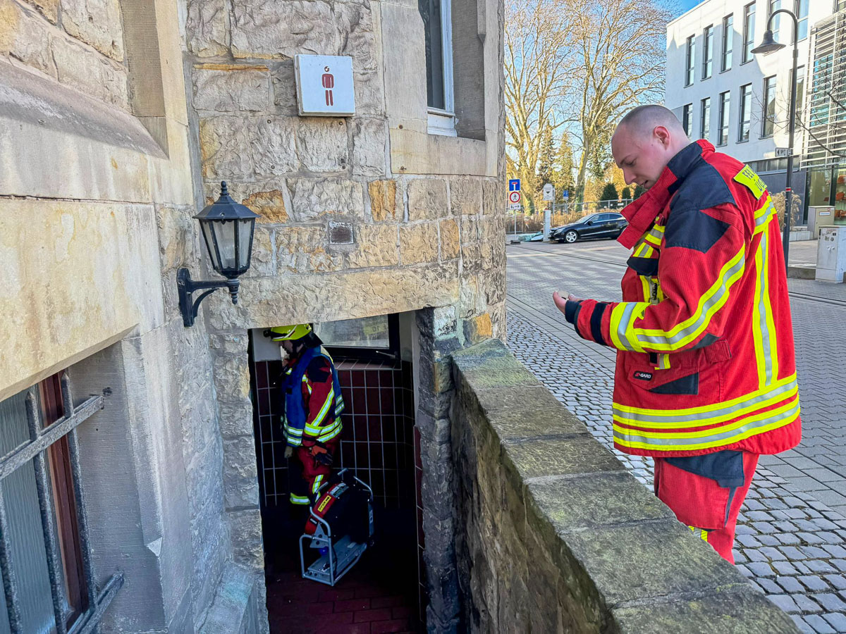 Durch unbekannte Brandstifter wurde Papier in der Herrentoilette in Brand gesteckt. Der Rauch breitete sich rasch aus und strömte durch ein geöffnetes Fenster in den Ratskellersaal, der sich direkt über den stillen Örtlichkeiten befindet.
