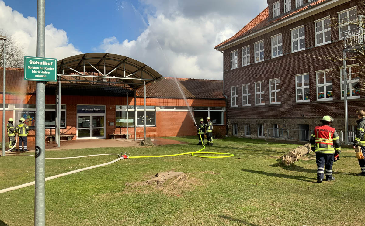 Nach einer kurzen Besprechung ging es zur Grundschule nach Heeßen. In den letzten Tagen hatte hier die Lehrerschaft fleißig das Evakuieren des Gebäudes geübt. Am Freitag wurde dies final nochmals durchgeführt – diesmal, aus Übungs– und Werbezwecken, zusammen mit der Feuerwehr.