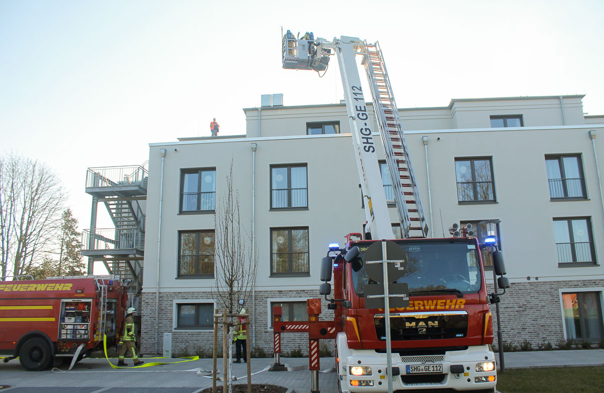 Hauke Heinitz und Gregor Zimmermann gaben als Lage vor, dass es im Bereich der Lüftungsanlage auf dem Dach zu einem Brand gekommen sei. Brandrauch zieht durch Ventilation in den Innenbereich des Gebäudes im 3. Obergeschoss. Eine unbekannte Anzahl von Personen befindet sich im östlichen Gebäudeteil. Aufgrund der ausgelösten Brandmeldeanlage werden die Feuerwehren der Samtgemeinde Niedernwöhren und die Hubrettungsbühne samt Tanklöschfahrzeug und Einsatzleitwagen der Feuerwehr Stadthagen nach Meerbeck alarmiert.