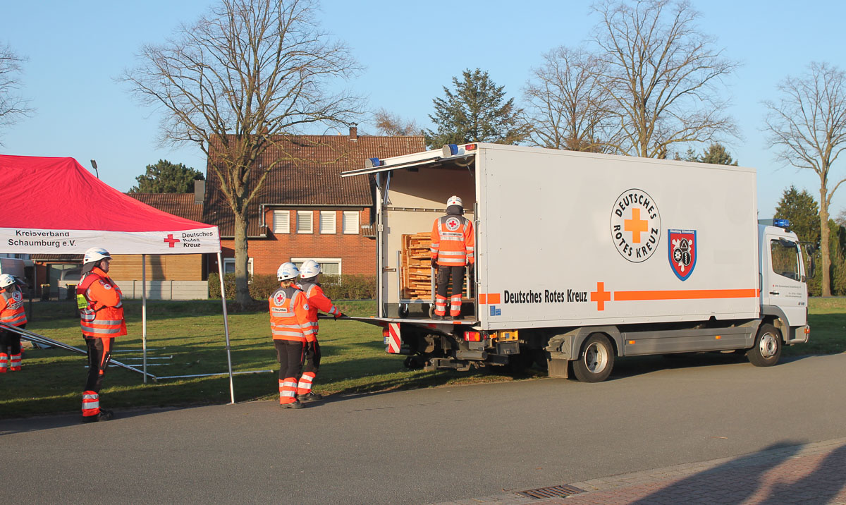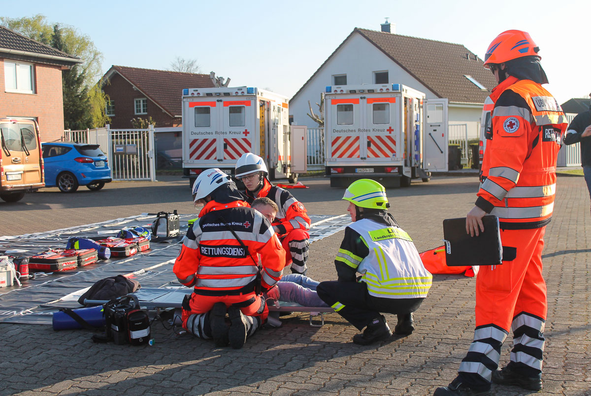 Einige Bewohner saßen im Rollstuhl oder konnten sich nur mit Rollatoren fortbewegen, andere wiederum waren bettlägerig und mussten samt Matratze gerettet werden. Über einen Treppenraum wurden die Personen nach und nach aus dem 3. Obergeschoss gerettet. Aufgrund der Lage wurden neben dem DRK Rettungsdienst Schaumburg, der DRK Einsatzzug zur Betreuung der Bewohner sowie die Örtliche Einsatzleitung Rettungsdienst des Landkreises mit einer leitenden Notärztin alarmiert. Die Feuerwehren führten die geretteten Personen dem Rettungsdienst zur Sichtung vor. Der Rettungsdienst nahm eine Triage – eine Priorisierung nach Verletzungsmuster – vor. Der DRK Einsatzzug baute zwischenzeitlich ein Betreuungszelt auf. Nachdem alle elf Personen gerettet, durch das DRK versorgt waren und der Brand gelöscht war, gab Gregor Zimmermann das Übungsende bekannt.