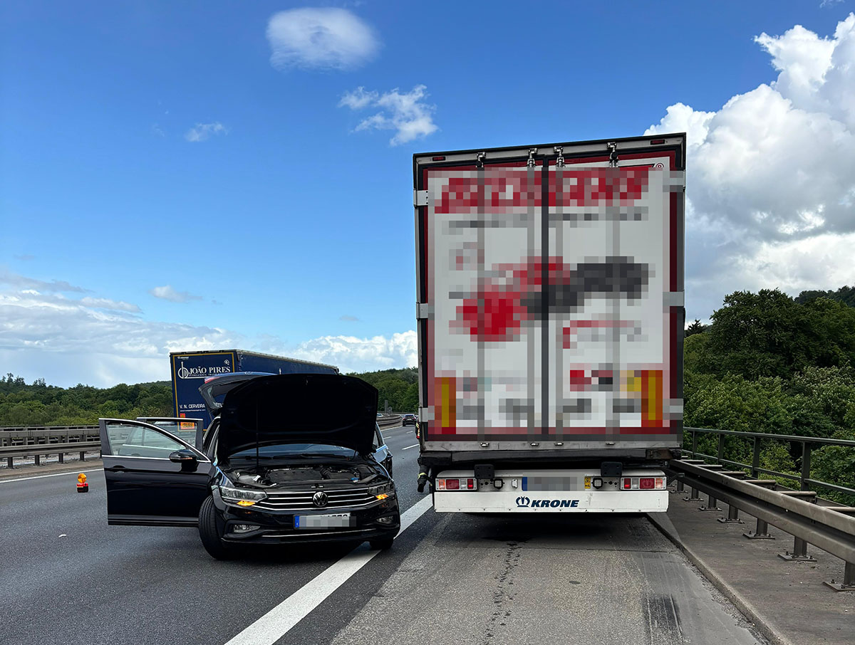 Der Unfall ereignete sich während eines Spurwechsels. Hier kam es zu einem Zusammenstoß zwischen einem PKW und einem LKW, wobei der PKW entgegengesetzt zur Fahrtrichtung zum Stehen kam.