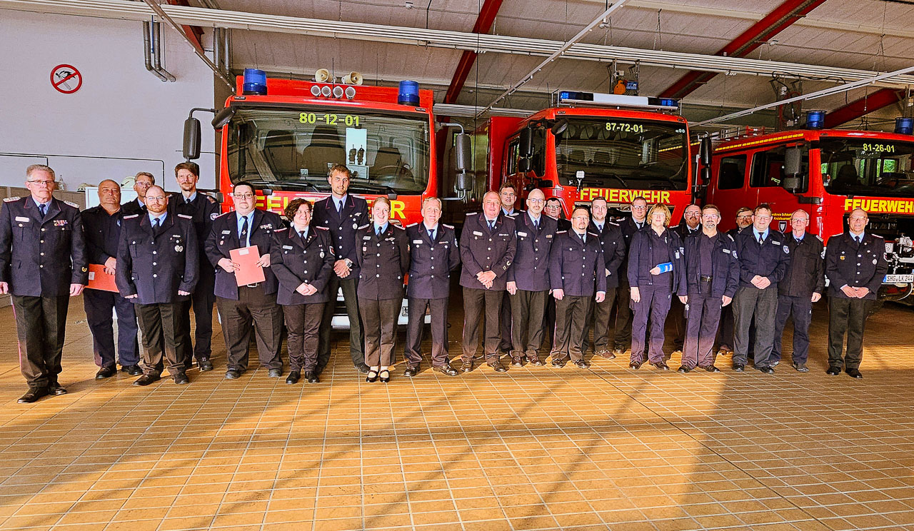 Zahlreiche Gäste aus der Kreisverwaltung und der Feuerwehrführung nahmen an der Veranstaltung teil. In ihren Ansprachen würdigten Landrat Jörg Farr und Kreisbrandmeister Klaus-Peter Grote, die außergewöhnlichen Leistungen der Einsatzkräfte an den Weihnachtstagen 2023.