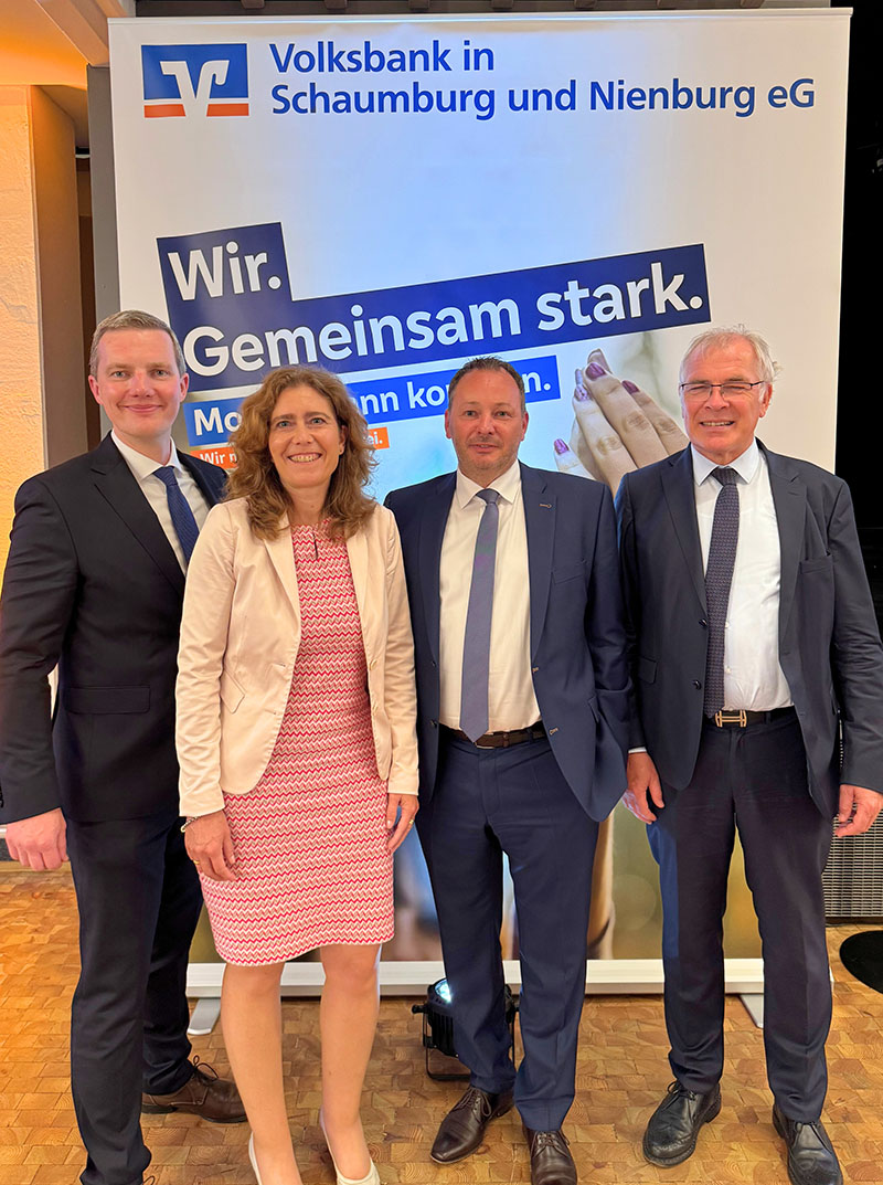 Zum Abschluss bat Dr. Krismann den derzeitigen Generalbevollmächtigten Christian Weiß auf die Bühne. Er stellte ihn als neues Vorstandsmitglied der Volksbank in Schaumburg und Nienburg vor. „Es freut mich sehr, die Zukunft unserer Bank aktiv mitgestalten zu können“, betonte Christian Weiß. „Wir sind gut aufgestellt und bereit für die Zukunft.“ Anfang Juli wird er seinen Dienst antreten und die bisherige Geschäftsführung, bestehend aus Anja Bracht, Joachim Schorling und Markus Strahler, ergänzen.