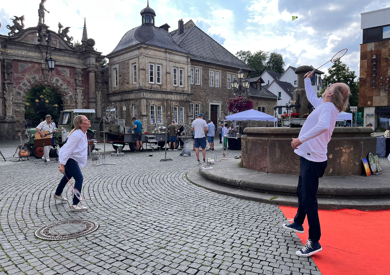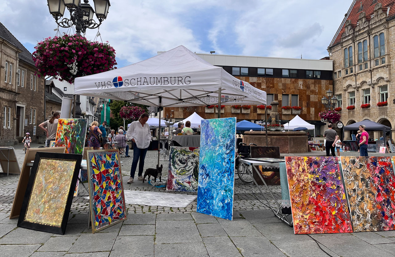 Christian Bonas zeigte seine vielseitigen Werke und detaillierten Bleistift-Portraits, Chris Müller begeisterte das Publikum mit seinen farbenfrohen, großformatigen und abstrakten Acrylgemälden. Abgerundet wurde das Kunstangebot durch die ansprechende und dekorative Holzkunst von der Rosentaler Hügelmühle. Untermalt wurde das bunte Kunsttreiben durch die passende Musik: Jochen Kluwe und Freunde sorgten für den richtigen Flow und setzten mit Spiel und Gesang dem Kunstmarkt die Sahnehaube auf. Die Stimmung war so entspannt, dass sogar einige Besucher die Fläche zwischen Brunnen und Kunst für muntere Sportaktivitäten nutzten.