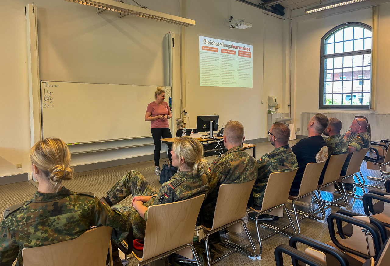 Nach einer kurzen Einführung durch die Dozentinnen Nadine Nelle, Gleichstellungsbeauftragte des Landkreises Schaumburg und Politikerin Sandra Schauer, hat sich rasch eine rege Diskussion entwickelt über alltägliche Problemstellungen von Soldatinnen. Es wurden zahlreiche Beispiele aus dem Dienstalltag genannt, die zum Nachdenken anregen und eine Reflexion ermöglichen. Auch das Thema sexuelle Belästigung – einschließlich sexistischer Sprache und sexualisierter verbaler Gewalt – war Bestandteil der Gespräche.
