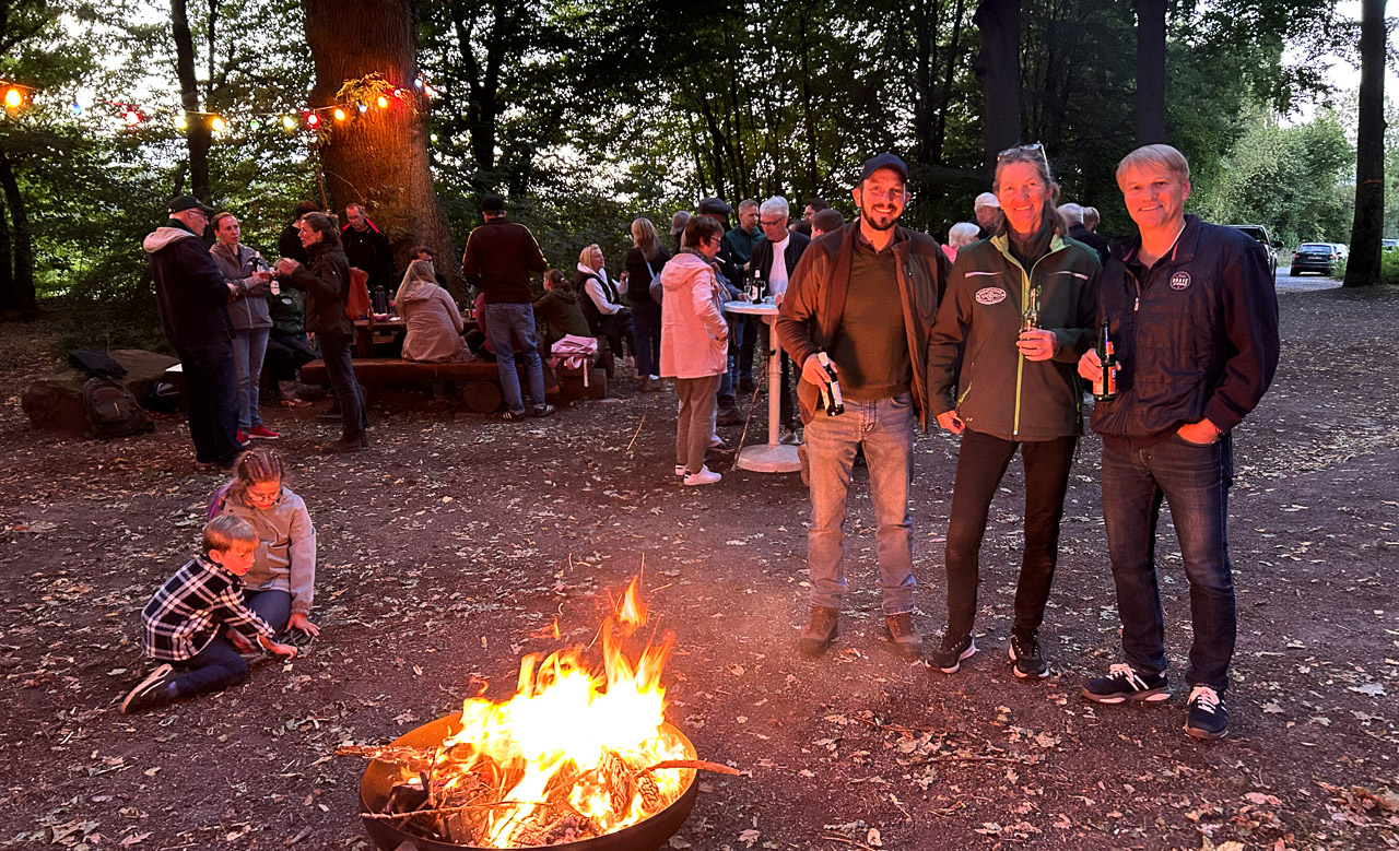 Ein großes Feuer in der Mitte des Platzes gab es aufgrund der zu großen Waldbrandgefahr in diesem Spätsommer nicht, dafür zwei mit trockenem Holz gefüllte Feuerschalen. Bei guten Gesprächen und einem phantastischen Ausblick über das nördliche Schaumburger Land genossen die Gäste den anfänglich sonnendurchfluteten Sommerabend bis um ca. 23.00 Uhr.
