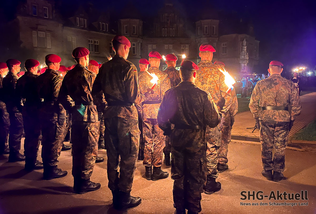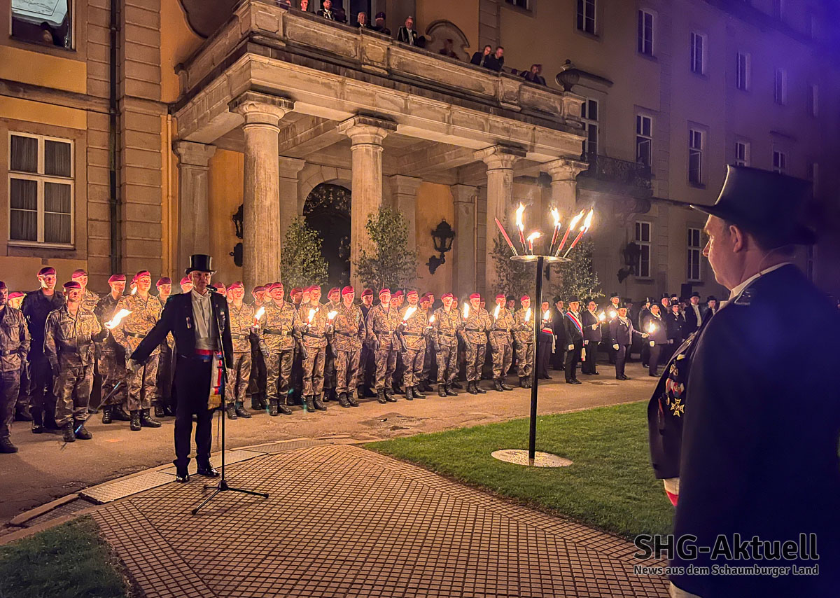 Um 21 Uhr herrschte eine gespannte Stille vor dem Bückeburger Schloss. Hunderte Zuschauer waren gekommen, um den großen Zapfenstreich zu verfolgen. Zeitgleich sammelten sich rund 400 Mitglieder des Bürgerbataillons und der Bundeswehr auf dem Marktplatz, um gemeinsam mit entzündeten Fackeln durch das Schlosstor auf den Schlossvorplatz zu marschieren. Im Fackelschein und im Gleichschritt stellten sich die Zylinderträger im Halbmond vor dem Schloss auf, begleitet vom Spielmannszug TSV Ahnsen und einer Delegation der Bundeswehr. Die Stimmung im Publikum war gebannt, das Zeremoniell im Fackelschein sorgte für Gänsehautmomente.