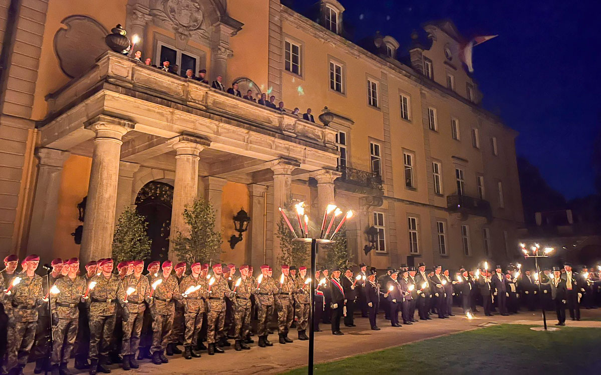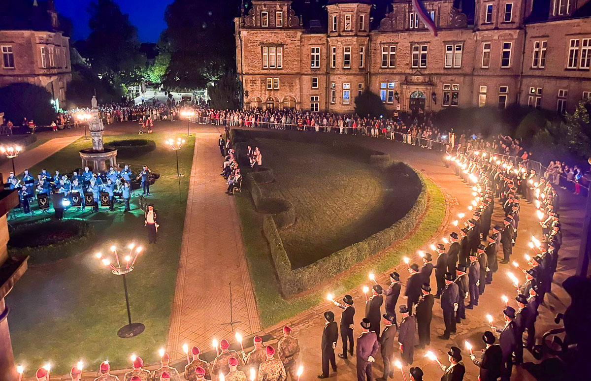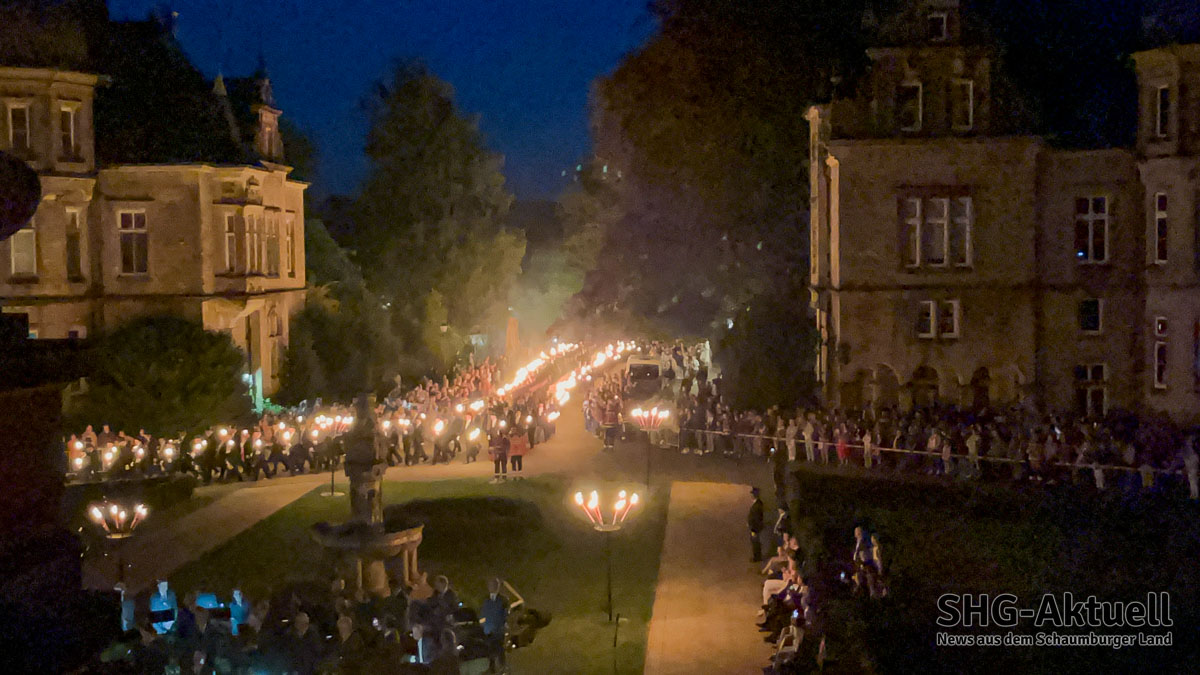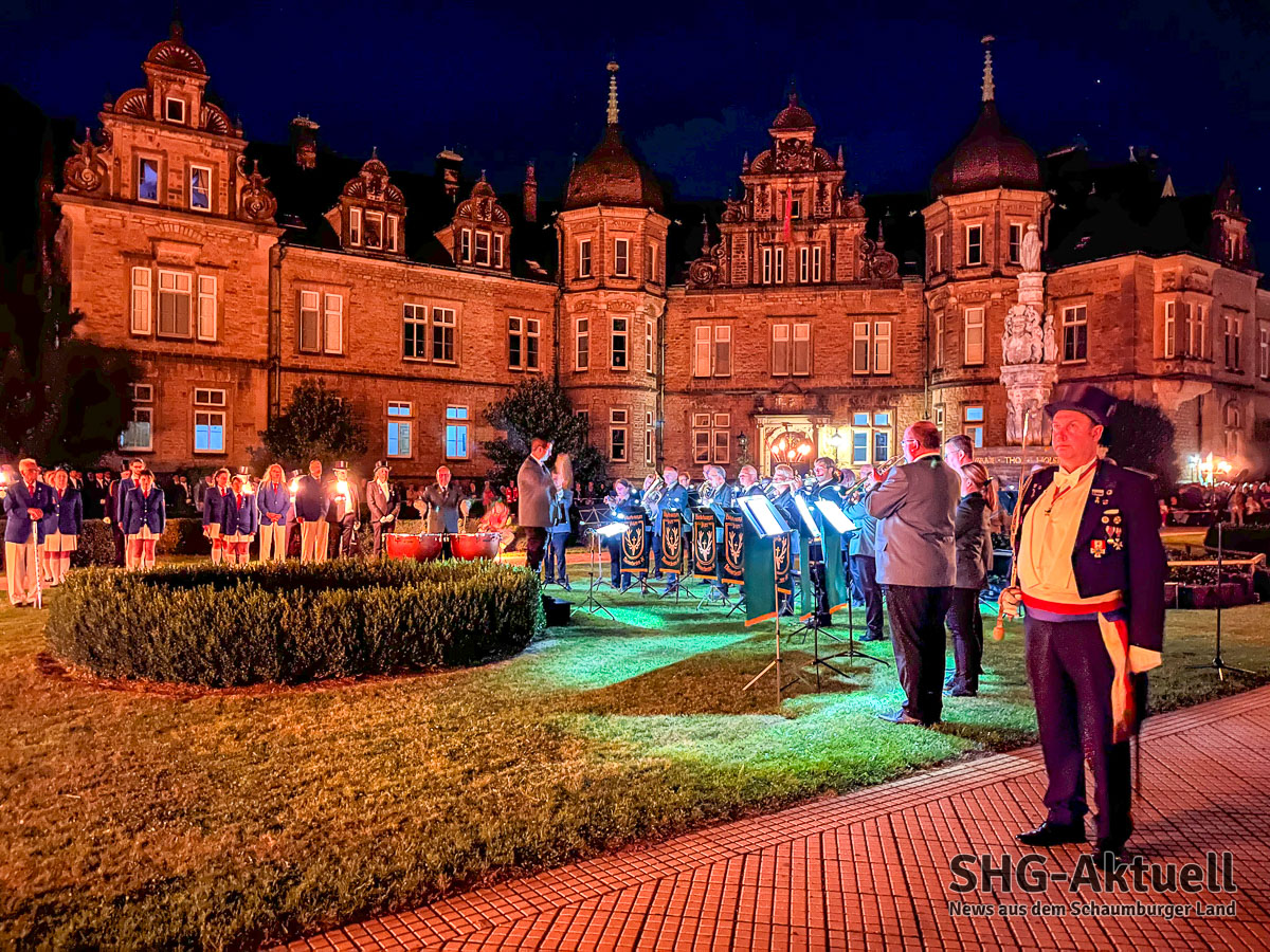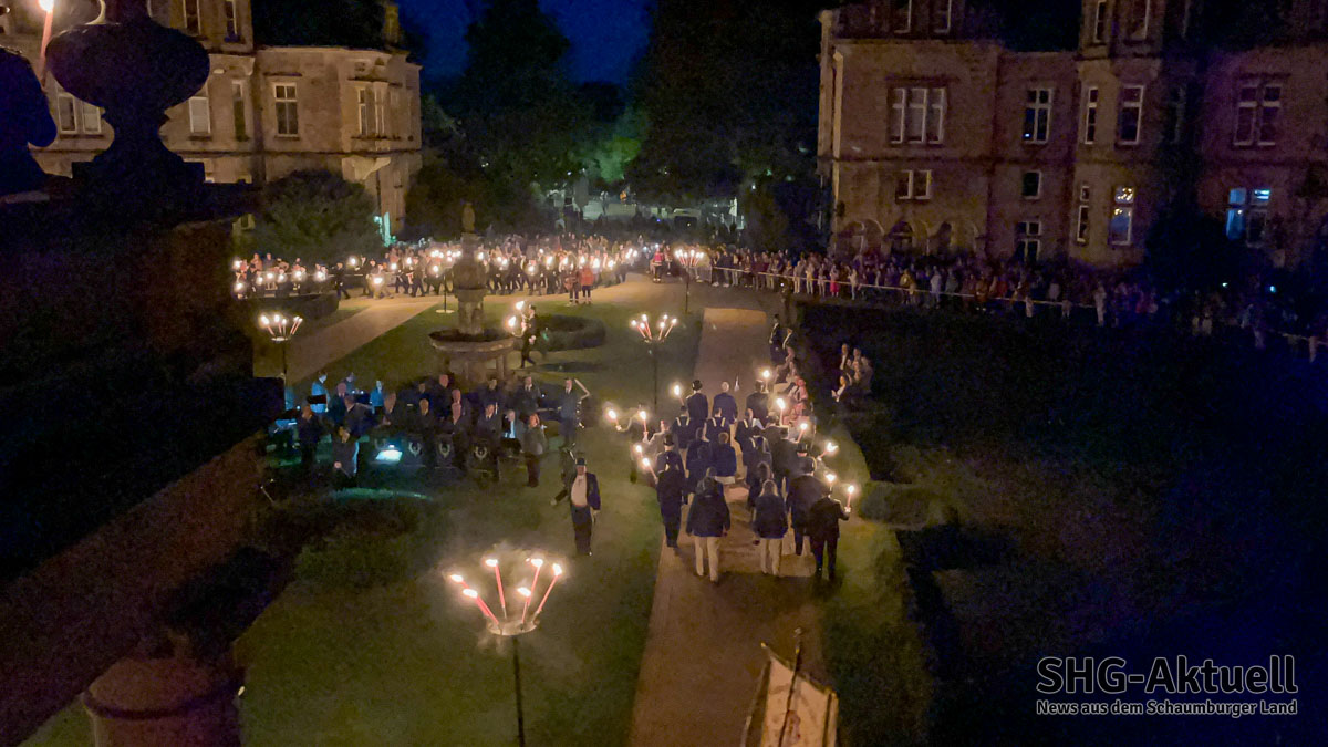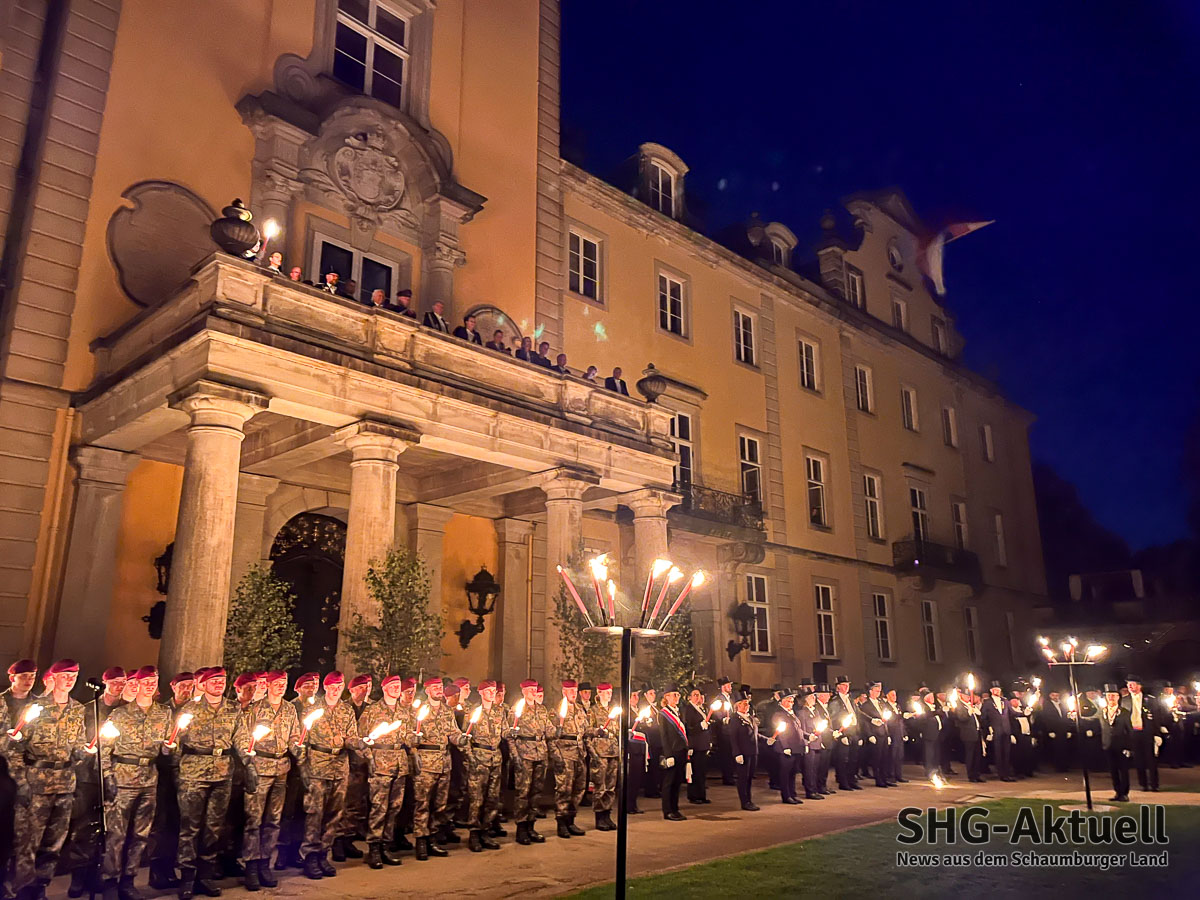 Um 21 Uhr herrschte eine gespannte Stille vor dem Bückeburger Schloss. Hunderte Zuschauer waren gekommen, um den großen Zapfenstreich zu verfolgen. Zeitgleich sammelten sich rund 400 Mitglieder des Bürgerbataillons und der Bundeswehr auf dem Marktplatz, um gemeinsam mit entzündeten Fackeln durch das Schlosstor auf den Schlossvorplatz zu marschieren. Im Fackelschein und im Gleichschritt stellten sich die Zylinderträger im Halbmond vor dem Schloss auf, begleitet vom Spielmannszug TSV Ahnsen und einer Delegation der Bundeswehr. Die Stimmung im Publikum war gebannt, das Zeremoniell im Fackelschein sorgte für Gänsehautmomente.