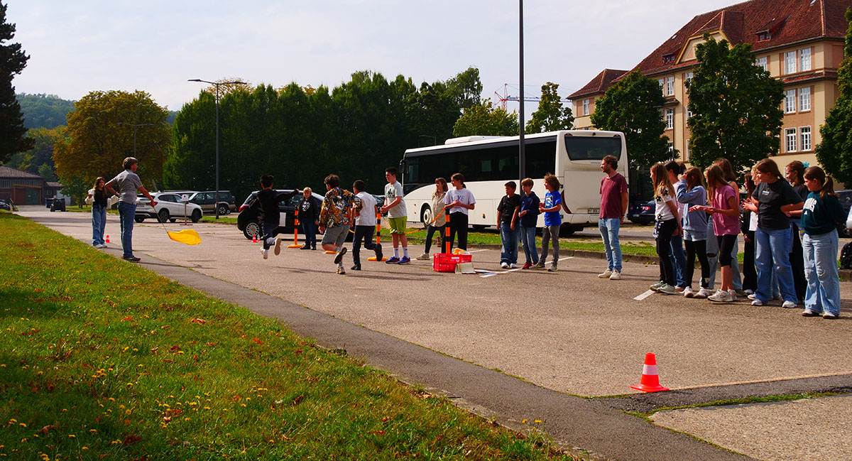 Mit Spaß an der Sache lernen die Schüler des Gymnasiums wichtige Aspekte zum Toten Winkel, dem Reaktions- und Bremsweg und üben dabei selbst, wie schnell eine Vollbremsung möglich ist.