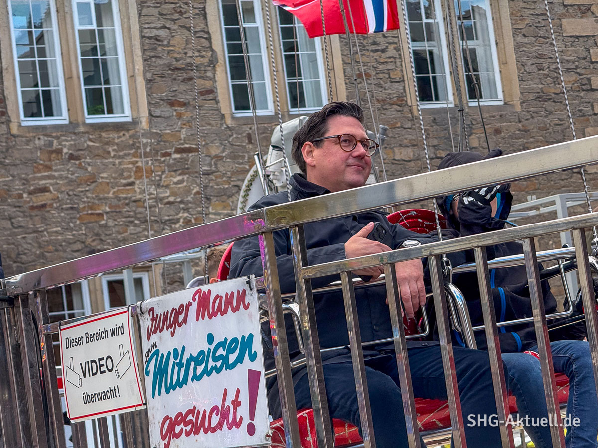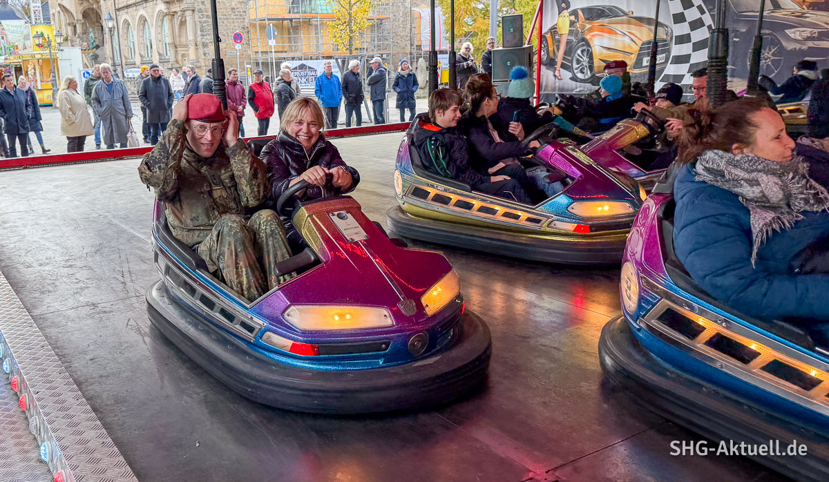 Diese Gelegenheit gab es bei der Eröffnung des 2025er Bückeburger Herbstmarktes bei einer Runde mit dem Autoscooter. Traditionell lud das Stadtoberhaupt zu einem Messerundgang „aufs Haus“ ein und der begann standesgemäß mit zwei unterhaltsamen Fahrten im beliebten Fahrgeschäft, an dem kleine Stupser und Kollisionen an der Tagesordnung sind.