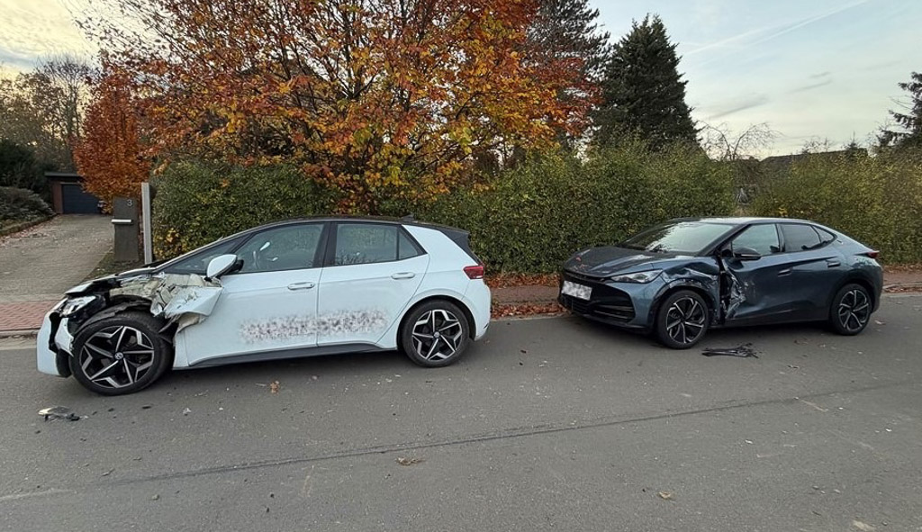 Die beiden geparkten PKW, ein Volkswagen und ein Cupra, waren nicht mehr fahrbereit. Der vordere, weiße VW wurde im Bereich des Kotflügels regelrecht aufgeschlitzt, ebenso der Cupra im Bereich von Kotflügel und Fahrertür. Der durch den Verkehrsunfall entstandene Sachschaden wird von der Polizei auf etwa 40.000 Euro geschätzt.