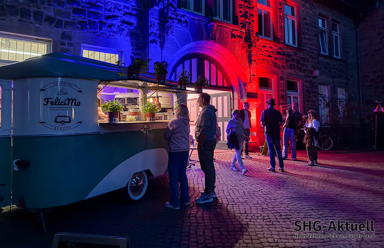 Vor dem VHS-Gebäude wird im nostalgischen Gastromobil von „FeliciMo“ Glühwein ausgeschenkt und Weihnachtspizza für den kleinen und großen Hunger angeboten.