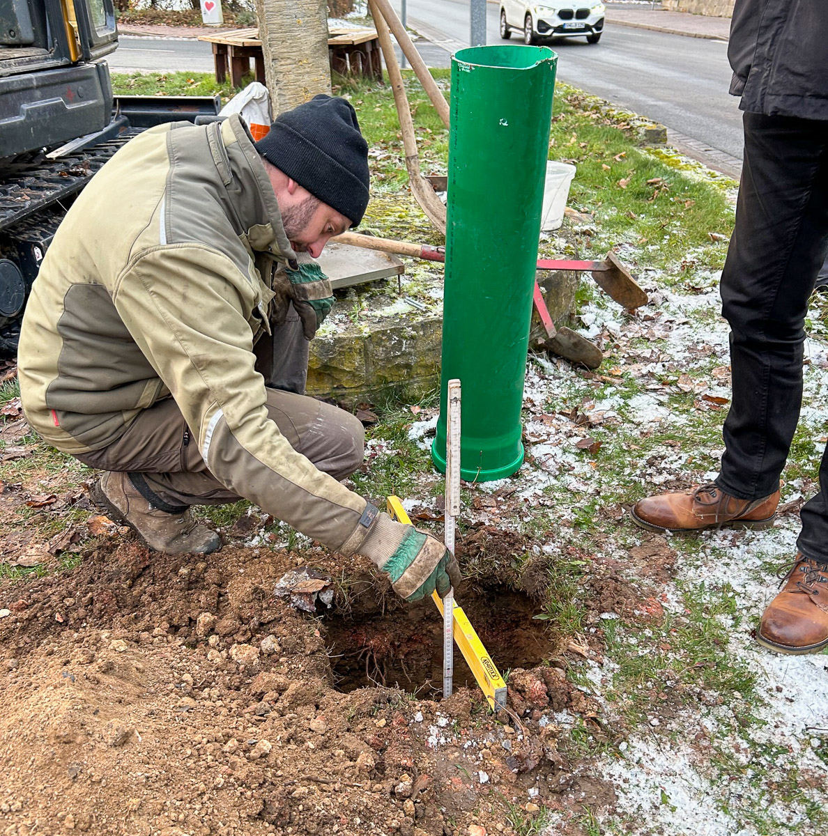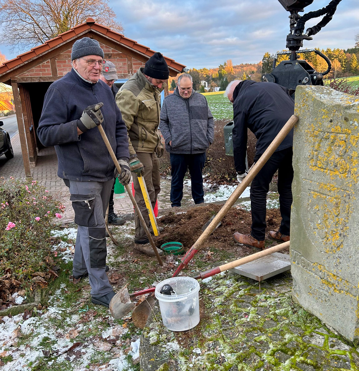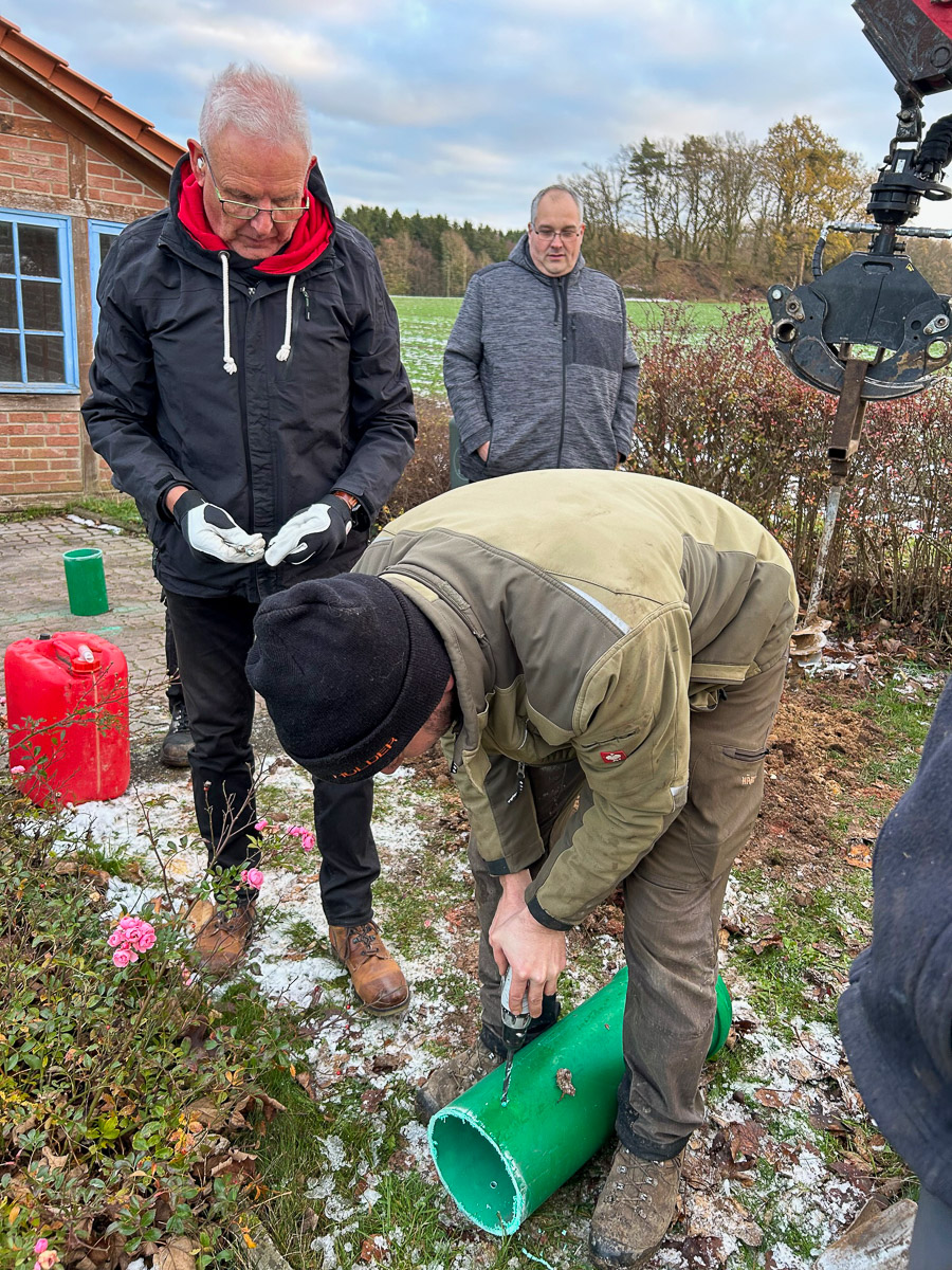 Wie im größten Stadthäger Ortsteil üblich, wurde nicht lange debattiert: Es wurde im Ortsrat eine einfache und kostengünstige Lösung gesucht: Ein um etwa 50 bis 60 Zentimeter in die Erde eingelassenes Rohr als zukünftige sichere Halterung auf dem angestammten Platz für den dörflichen Weihnachtsbaum. Das Rohr wurde von dem Baggerbetrieb Vehling aus Helpsen gespendet. Nachdem klar war, dass durch das Ausheben bzw. Bohren des Erdbohrers am Minibagger des Ortsbürgermeisters Michael Koller keine Versorgungsleitungen beschädigt werden würden, genehmigte die Verwaltung den ausgesuchten Platz.