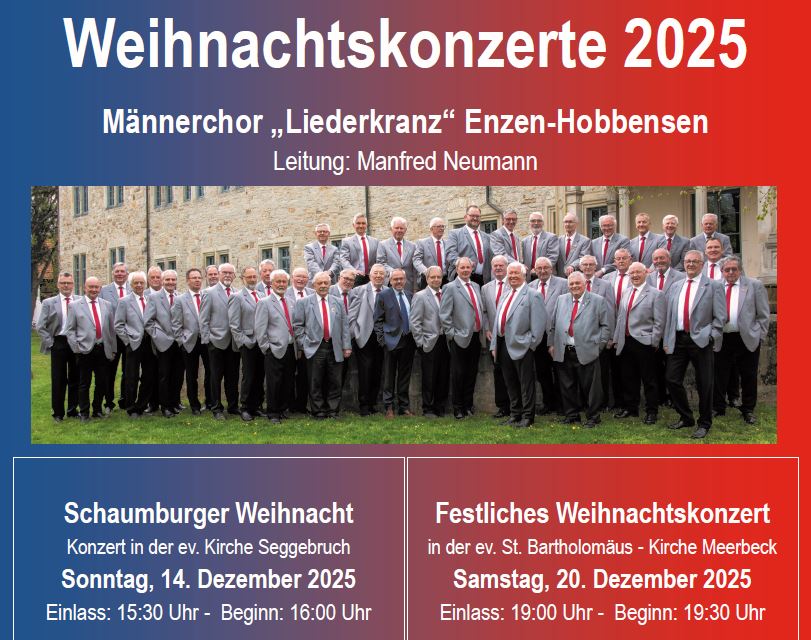 Das Konzert „Schaumburger Weihnacht“ findet am 14.12.2025 (3. Advent) um 16 Uhr in der Kirche zu Seggebruch statt, das „Festliche Weihnachtskonzert“ folgt dann am 20. Dezember um 19:30 Uhr in der Kirche zu Meerbeck.