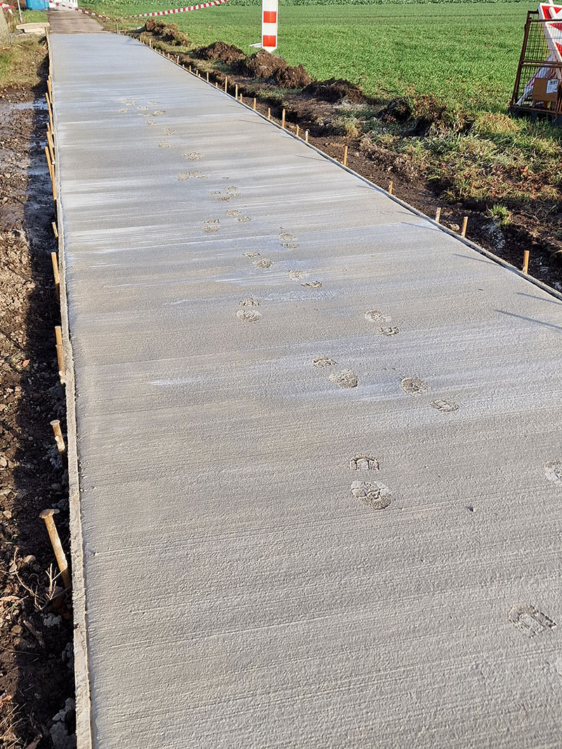 „Wir haben leider im frisch sanierten Weg Fußspuren entdeckt, die darauf schließen lassen, dass eine Person den abgesperrten Weg unerlaubterweise genutzt hat, offensichtlich kurz nach der Betonierung“, so Markus Brockmann, Leiter des Hamelner Geschäftsbereichs der Niedersächsischen Landesbehörde für Straßenbau und Verkehr (NLStBV).