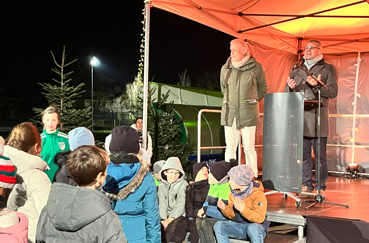 Für das Wetter war wie jedes Jahr die Kirche zuständig – Landesbischof Oliver Schuegraf hatte diese Aufgabe ernst genommen und freute sich mit allen Anwesenden über die milden Temperaturen. Stimmungsvoll stimmten die Besucher gemeinsam „Es ist ein Ros entsprungen“, „Macht hoch die Tür“ und „Lasst und froh und munter sein“ an und lauschten der Weihnachtsgeschichte, wie immer in verkürzter Form stimmungsvoll vorgetragen von VfL-Präsident Martin Brandt.