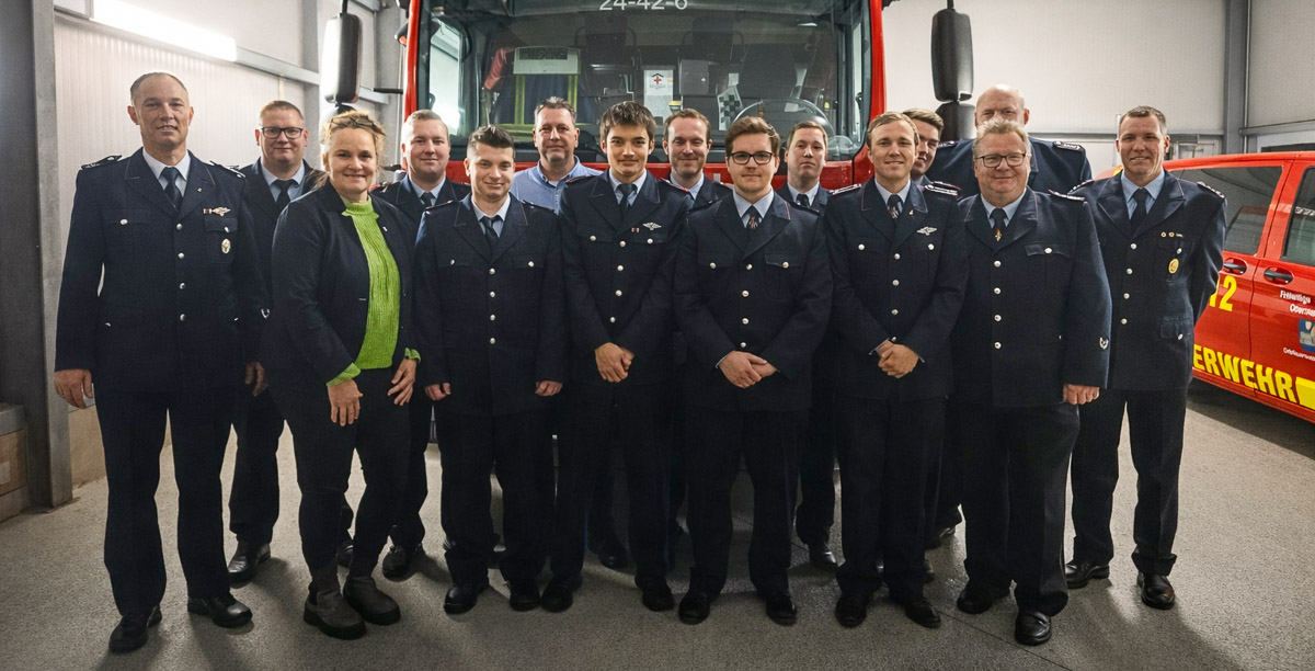 Zudem standen zahlreiche Beförderungen an: Fabian Busche wurde in den aktiven Dienst aufgenommen und zum Feuerwehrmann-Anwärter ernannt. Lukas Meyer wurde zum Feuerwehrmann und Maksim Volkohon zum Oberfeuerwehrmann befördert. Tom-Tristan Diekmann, Clemens Fischer, Robert Schuster und Carsten Weiser wurden zu Ersten Hauptfeuerwehrmännern ernannt.