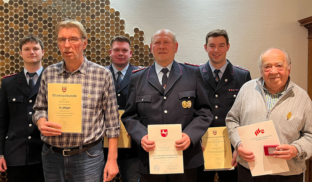 Für 50 Jahre aktiven Dienst wurde Heinz Fahlbusch, für 50 Jahre passive Mitgliedschaft wurde Manfred Spittler sowie für 60 Jahre passive Mitgliedschaft wurde Heinz Dollweber geehrt.